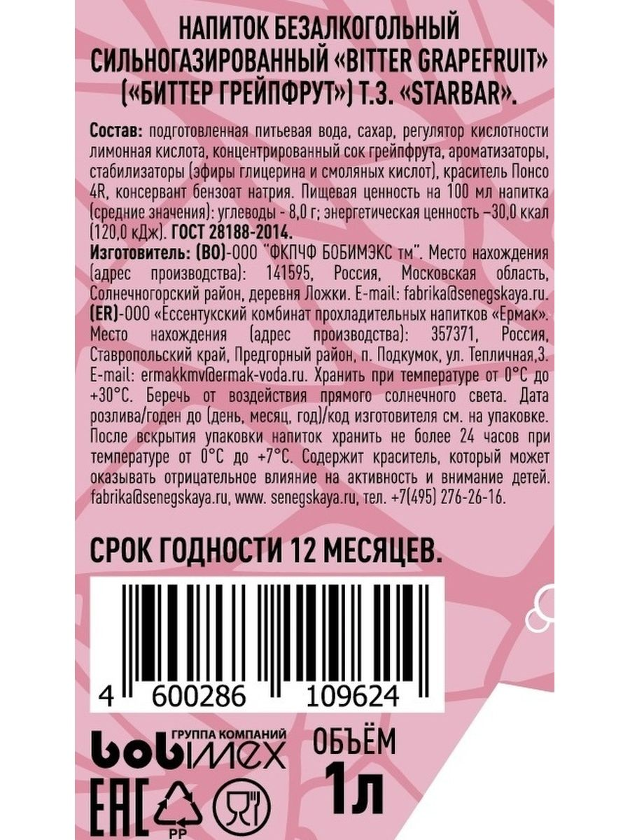 Напиток Star Bar Bitter Grapefruit газированный, 1л с концентрированным соком грейпфрута отлично утоляет жажду, а также подходит для приготовления коктейлей.