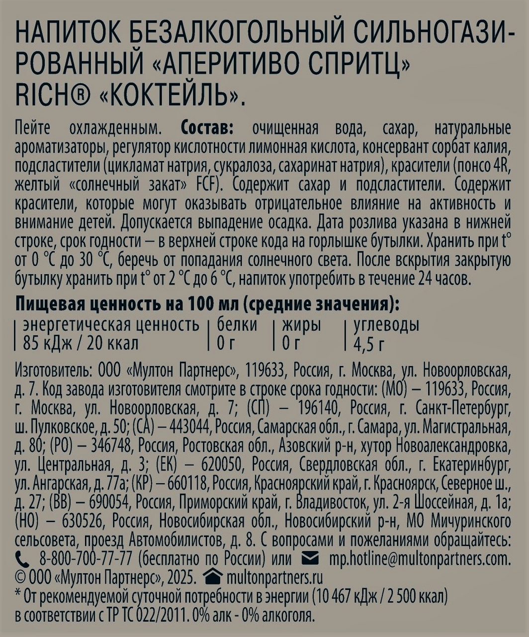 Напиток Rich Аперитиво Спритц газированный, 1л x 12 шт - это сильногазированные напитки высокого качества с особенным вкусом для настоящих ценителей. Попробуйте новинку Rich Аперитиво - это безалкогольный коктейль с пониженной калорийностью и утончённым характером для тех, кто выбирает сложные вкусы и эстетичные моменты. Оцените изысканное сочетание насыщенных нот апельсина, благородной травяной горчинки и деликатных оттенков игристого вина, создающих гармоничный, многослойный вкус. Идеально подходит для самостоятельного потребления, а также для приготовления коктейлей.