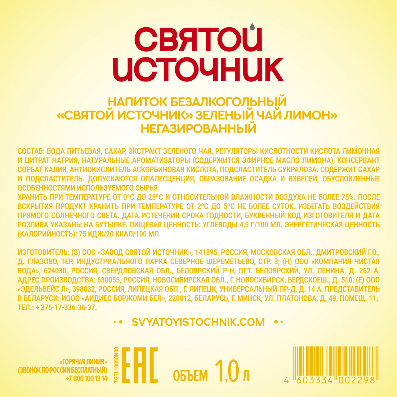 Холодный чай Святой Источник зеленый со вкусом лимона, 1л