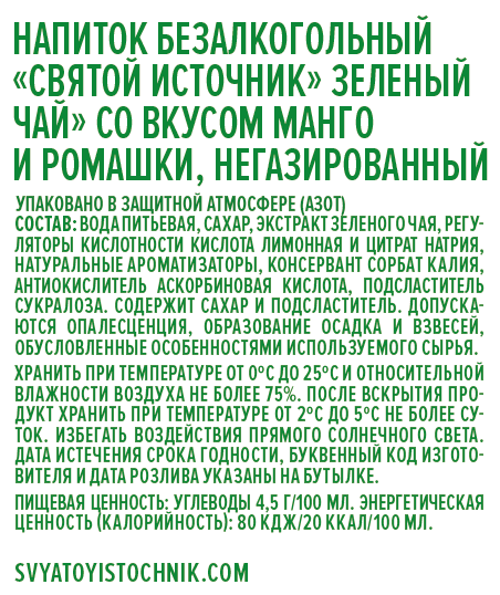 Чай зеленый Святой Источник холодный манго-ромашка, 1л x 6 шт - это природный чай на основе чистой негазированной воды с нежным вкусом спелого Манго и нотками ромашки. Источник радостных открытий в течение дня. Чистая вода и природные экстракты чая помогут освежиться в любой момент, а оригинальные сочетания сбалансированных вкусов привнесут разнообразие в привычный рацион.