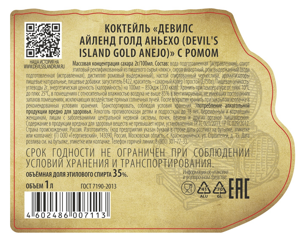 Коктейль Devil's Island Gold Anejo с ромом, 1л