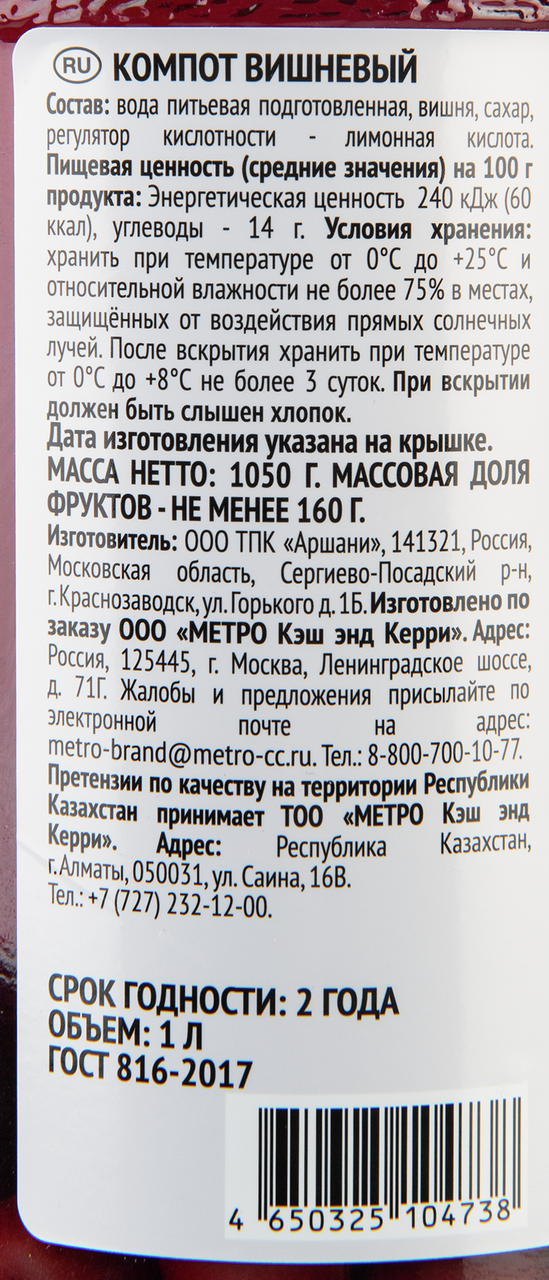 Приготовлен без использования консервантов и красителей. Содержит только натуральные компоненты. Напиток имеет приятный ягодный вкус с умеренной сладостью. Он хорошо утоляет жажду и освежает. Вишневый компот можно пить просто так или превратить его в охлаждающий лимонад.
