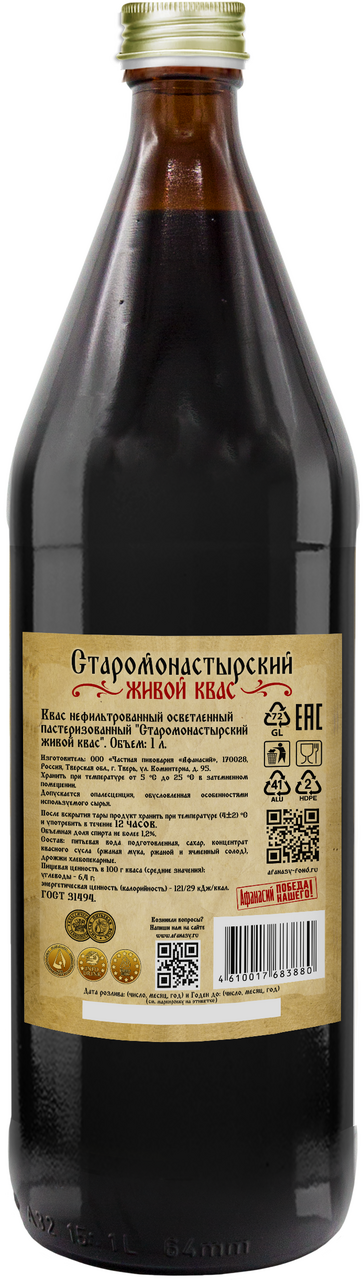 Квас Афанасий Старомонастырский живой, 1л - натуральный вкус истинного старинного напитка, сваренного из ржаного и ячменного солода по ГОСТу. Благодаря молочной кислоте прекрасно утоляет жажду. Напиток обладает высокой энергетической ценностью. За счет углекислоты, квас способствует более легкому перевариванию, всасыванию пищи и повышает аппетит. Также продукт содержит свободные аминокислоты, сахара и микроэлементы. Используется как прохладительный напиток, а также как основа для окрошки.