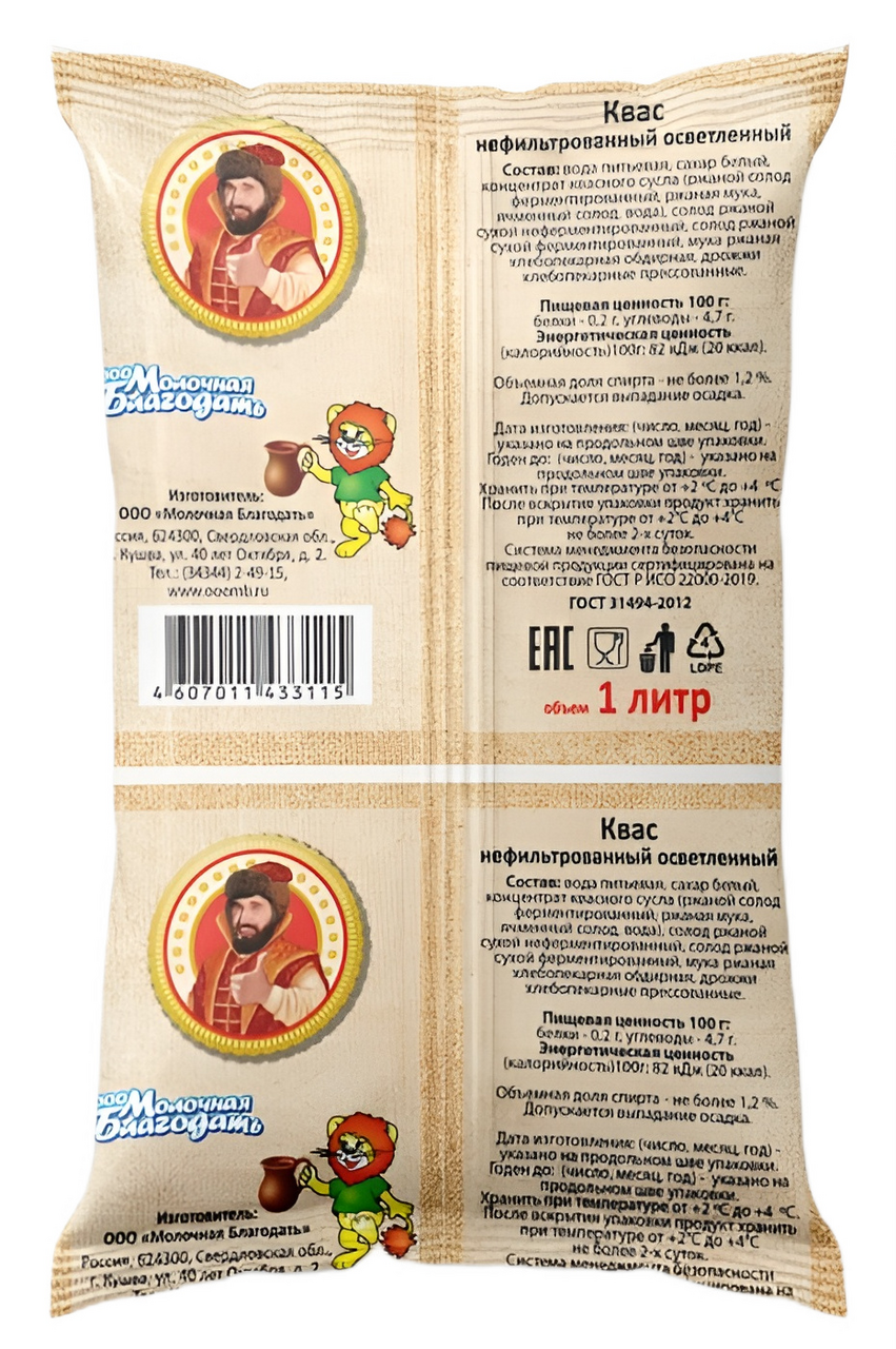 Квас Молочная благодать нефильтрованный осветленный, 1л