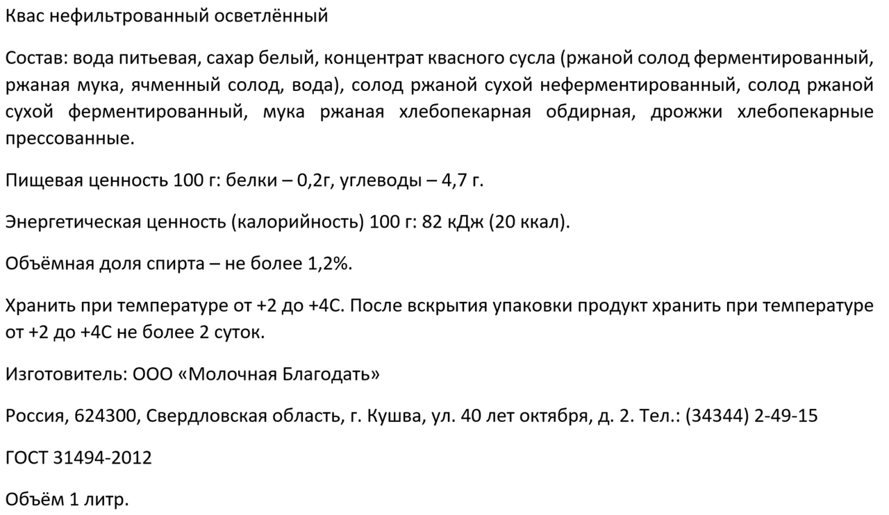 Это продукт живого брожения, не подвергавшийся фильтрации. Отлично утоляет жажду и подходит для холодных супов и окрошки.