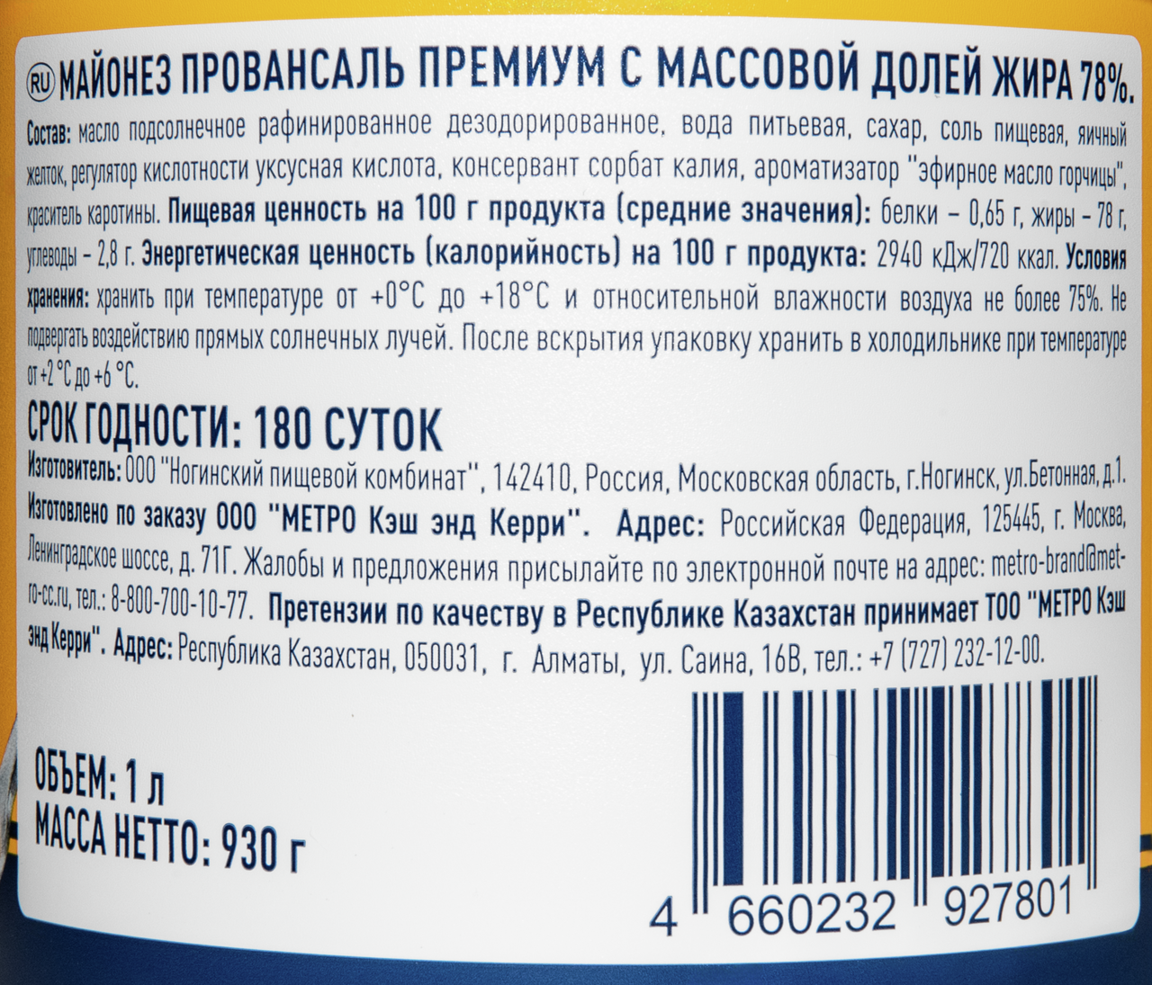 Metro Chef Майонез Провансаль 78%, 1л в небольшом пластиковом ведре удобен как для профессионального использования так и для семьи. Обладает насыщенным вкусом, жирной, густой консистенцией, сделан из яичных желтков и универсален в применении - его можно использовать и для простых домашних рецептов, и для сложных профессиональных блюд. Майонез 78% особенно хорош для запекания, равномерно распределяется и держит форму. Его также можно использоваться как густую заправку для салатов, в качестве соуса для горячих блюд, для приготовления других соусов.