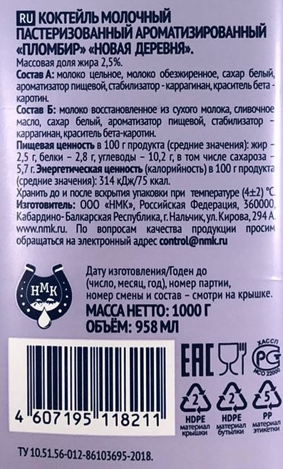 Состав А: молоко цельное, молоко обезжиренное, сахар белый, ароматизатор пищевой, стабилизатор - каррагинан, краситель бета - каротин. Состав Б: молоко восстановленное из сухого молока, сливочное масло, сахар белый, ароматизатор пищевой, стабилизатор - каррагинан, краситель бета-каротин.