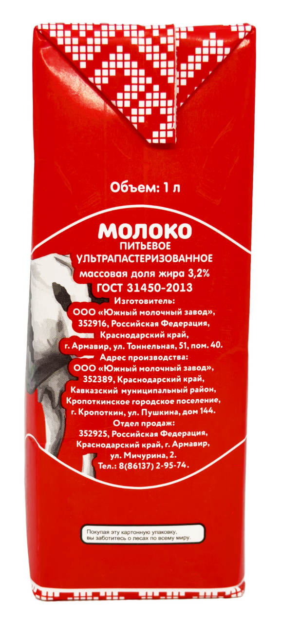 Молоко Любаня из Кубани ультрапастеризованное 3.2%, 1л