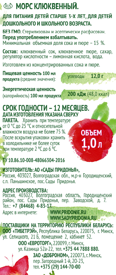 Морс Сады Придонья с клюквой, 1л x 12 шт - отличная поддержка иммунитета в сезон простуд. Клюква – ценный источник витамина С и антиоксидантов, особенно кверцетина, который положительно влияет на иммунитет, подавляя развитие воспалительных процессов в организме и повышая его общий жизненный тонус.
