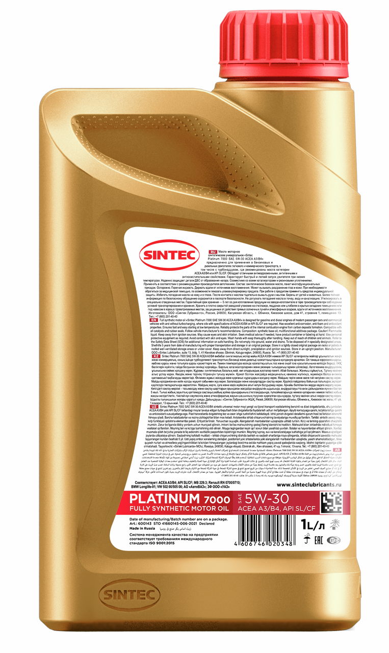 Производится на основе высококачественных синтетических базовых масел и высокоэффективного многофункционального пакета присадок от компании AFTON Chemicals. Идеально подходит для обслуживания большинства новейших бензиновых двигателей американских, японских и корейских автопроизводителей. Рекомендуется для бензиновых двигателей как с турбонаддувом, так и без него, где требуется пониженный расход топлива и усиленная защита. Обеспечивает легкий пуск двигателя при отрицательных температурах окружающего воздуха и отличную смазку с первых секунд работы. Sintec PLATINUM SAE 5W-30 ILSAC GF-5 API SN является аналогом самых современных топовых моторных масел. Обладает усиленными защитными системами эмиссионного контроля, противоизносными свойствами. Устанавливает более высокий контроль над шламами, отложениями, окислительными процессами. Продукт нейтрален к резинотехническим и полимерным изделиям.