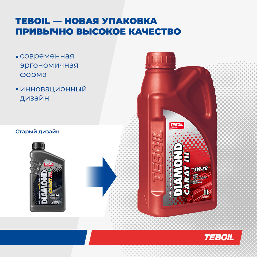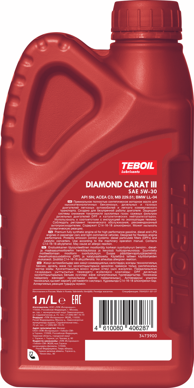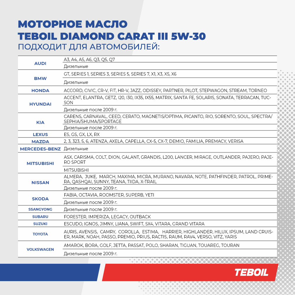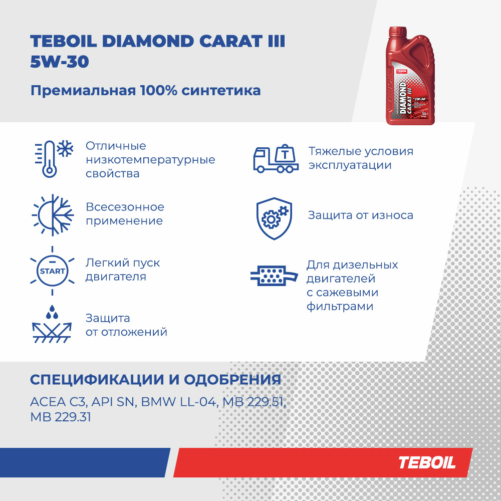 Полностью синтетическое моторное масло с увеличенным интервалом замены для бензиновых и дизельных двигателей легковых автомобилей, в том числе оборудованных турбонаддувом и системами доочистки выхлопных газов (каталитическими нейтрализаторами и фильтрами сажевых частиц). Teboil Diamond Carat III 5W-30 обеспечивает отличную защиту двигателя от износа в жестких условиях эксплуатации, а исключительно стабильный загуститель сохраняет эффективные вязкостно-температурные свойства моторного масла в течение всего срока эксплуатации. Бензиновые, дизельные и газовые двигатели легковых автомобилей и легкого коммерческого транспорта. Подходит для двигателей с турбонаддувом, системой прямого впрыска топлива, сажевыми фильтрами (DPF) и каталитическими нейтрализаторами.