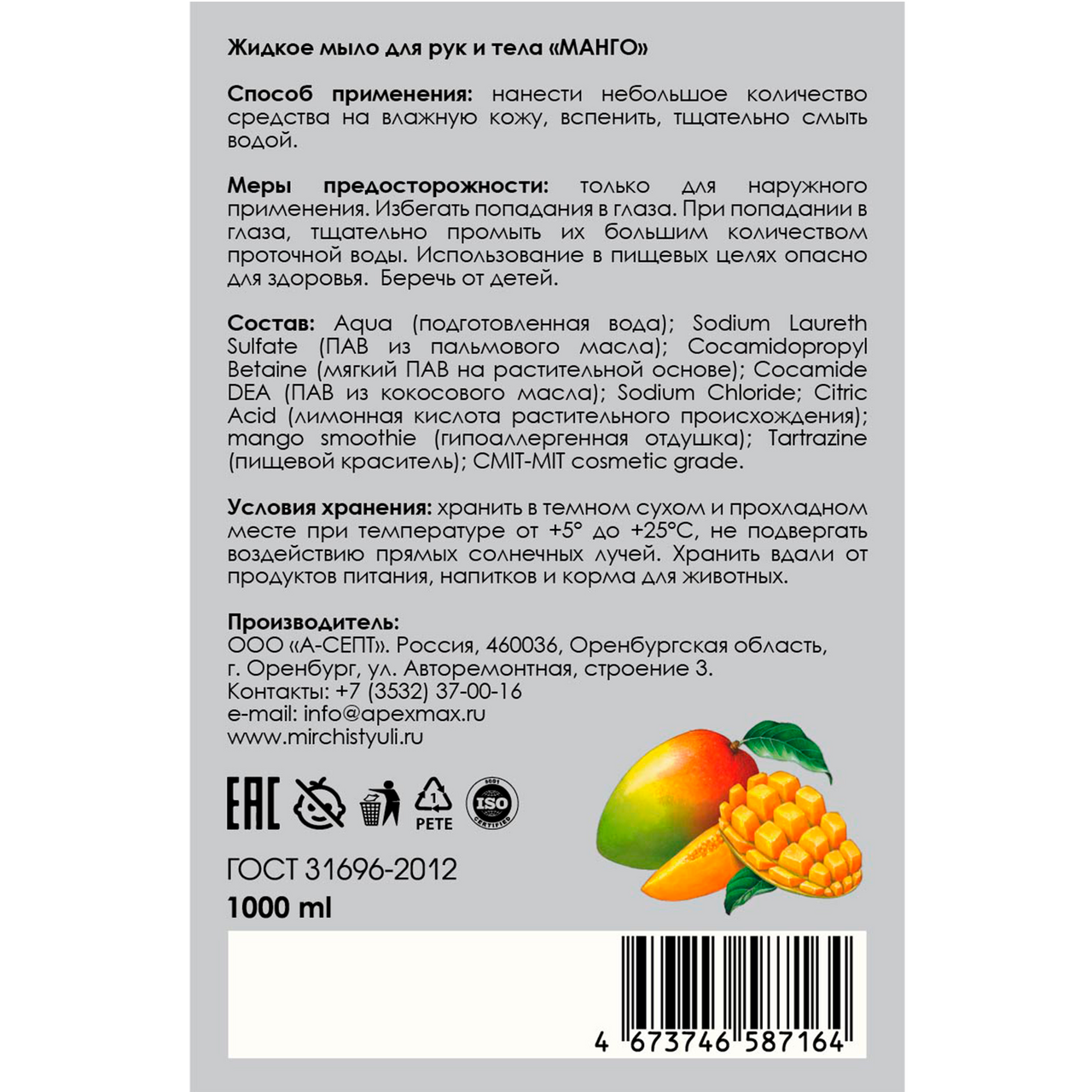 Мыло с ароматом манго подходит для частого применения. Жидкое мыло для рук Мир Чистюли с ароматом манго подходит для мытья рук и тела. Бережно и эффективно очищает. Устраняет неприятные запахи. Легко смывается. Подходит для частого использования. Способ применения: нанести небольшое количество средства на влажную кожу, вспенить, тщательно смыть водой.