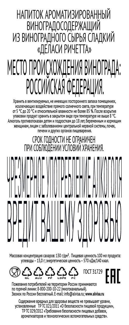 Delasy Ricetta — новинка в линейке Деласи, яркий, освежающий напиток, демонстрирующий гармоничное сочетание красного апельсина, полыни и трав. Оригинальная рецептура держится в строжайшем секрете, известно только, что в составе есть натуральные экстракты черной моркови и черной смородины, персиковый и вишневый сок, красные сицилийские апельсины, полынь, травяной экстракт и белое вино. Вермут подается охлажденным, его можно пить как в чистом виде со льдом, так и смешивая с напитками: соком, содовой или лимонадом, а также использовать для приготовления коктейлей.