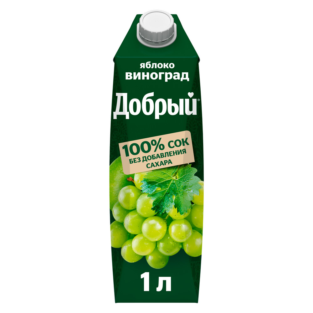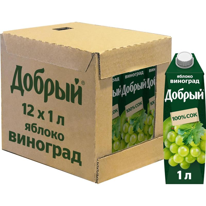 Нектар Добрый яблоко-виноград, 1л x 12 шт - натуральный напиток для всей семьи. Производится из отборных спелых яблок и сочного ароматного винограда. Обладает насыщенным сладким виноградным вкусом с деликатной яблочной кислинкой. Является ценным источником витамина С, калия и железа. Не содержит добавленного сахара, искусственных ароматизаторов, красителей и консервантов. Способствует укреплению иммунитета, повыш��ет общий тонус организма, отлично утоляет жажду и освежает. Подходит для детей с 3-х лет. Обладает насыщенным, сладким вкусом белого винограда с яблочной кислинкой. Богат калием, содержит антиоксиданты и железо. Без добавленного сахара и консервантов. В удобной упаковке для семейного обеда или ужина.