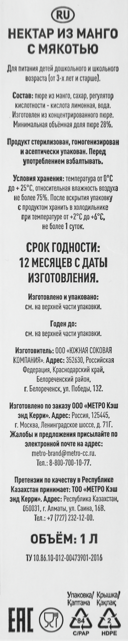 Нежный, освежающий натуральный нектар, созданный из пюре манго (29%), воды, тростникового сахара и регулятора кислотности лимонной кислоты. Нектар прекрасен в качестве самостоятельного напитка, может употребляться в течение всего дня, во время трапезы, подходит для людей, ведущих здоровый образ жизни. В напитке нет искусственных красителей, ароматизаторов и других вредных ингредиентов, поэтому нектар подходит для питания детей с трехлетнего возраста. Благодаря особой упаковке в нем долгое время сохраняют все полезные свойства манго.