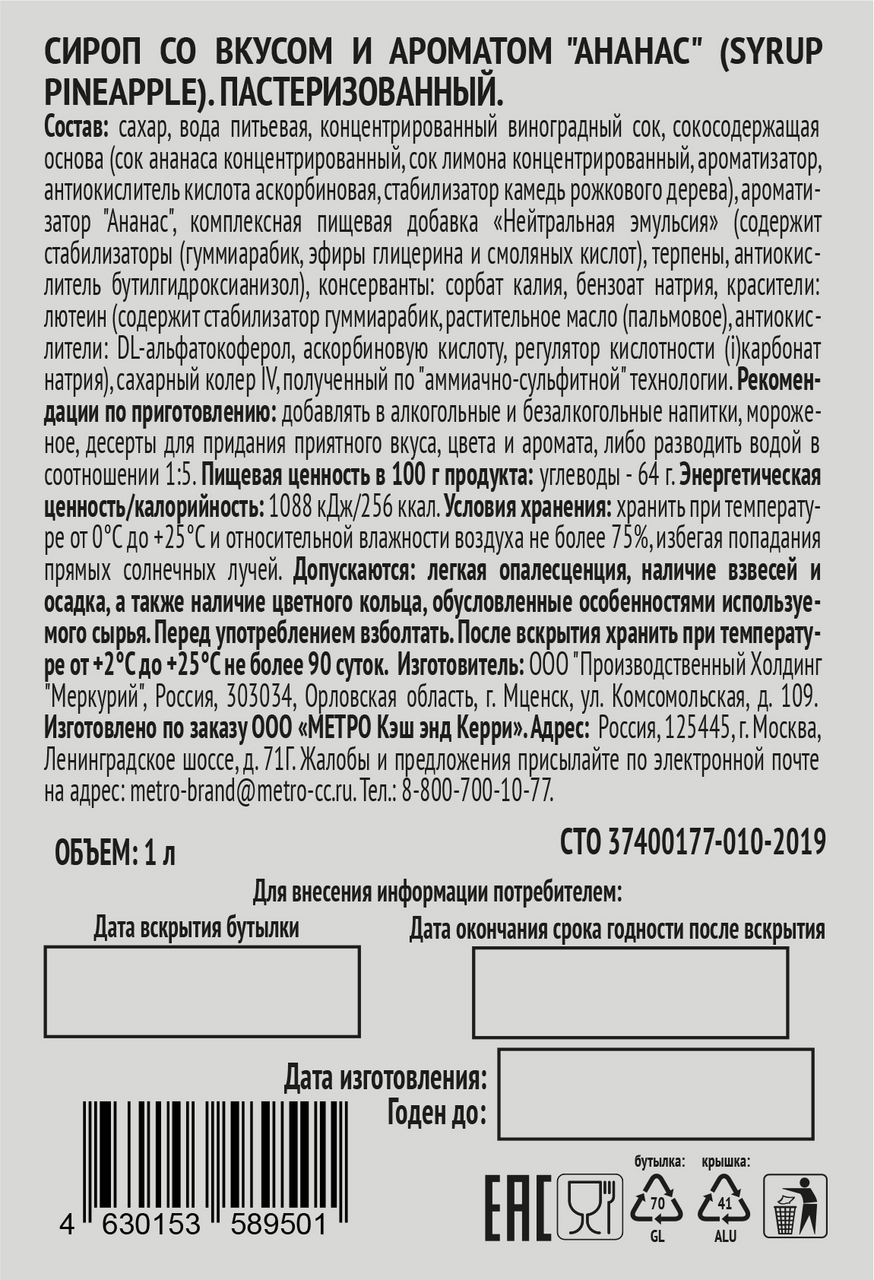 Сироп с ярким, насыщенным вкусом ананаса. Густой, ароматизированный. Изготовлен из натуральных ингредиентов. Идеально сочетается с кофе, барными и молочными коктейлями. Широко используется в кулинарии для украшения мороженого, тортов, пирожных. Применяется в качестве пропитки для коржей и выпечки. Для употребления следует разбавлять водой в пропорции 1:7. Может быть использован для приготовления коктейлей.