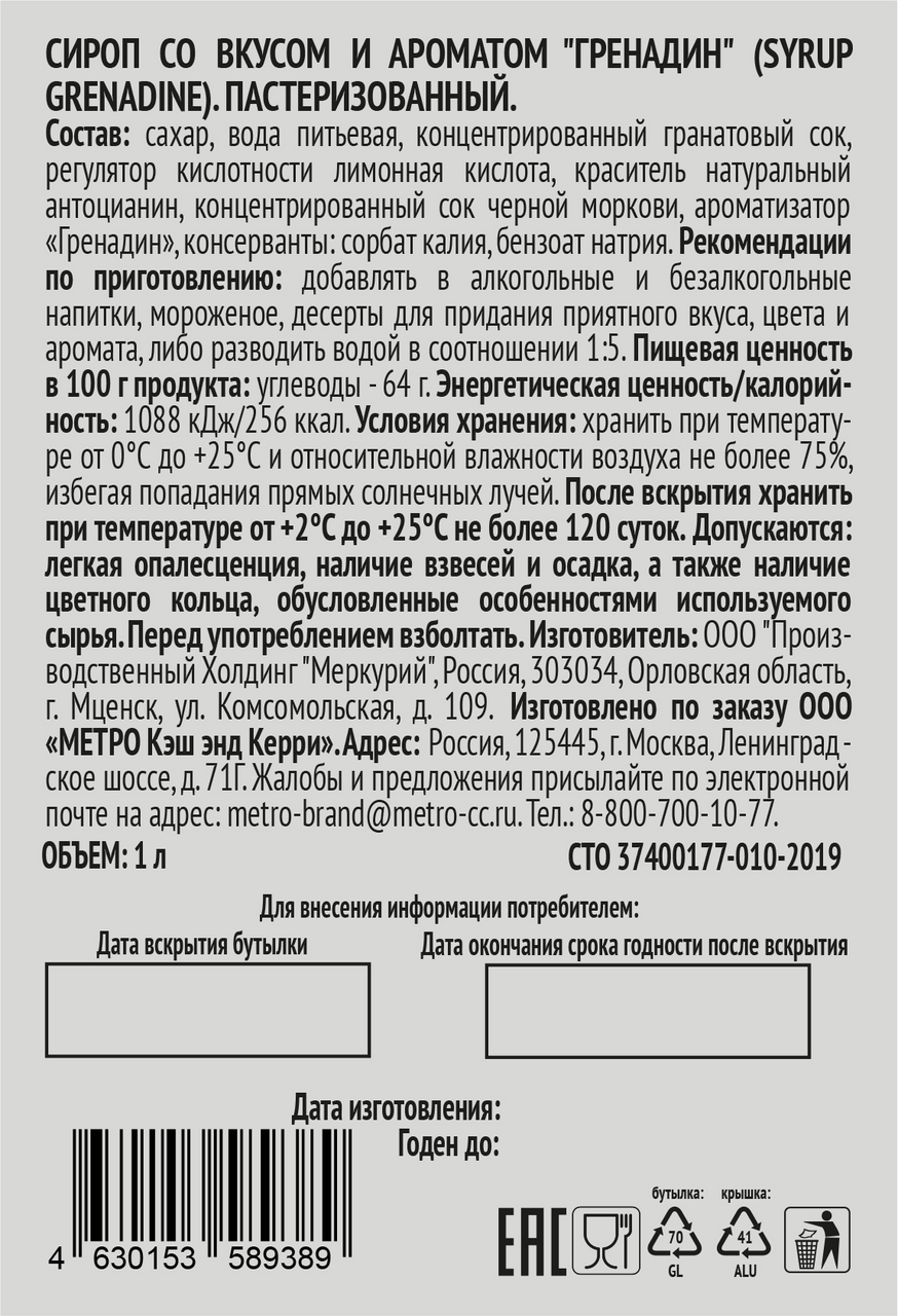 Сахар, вода питьевая, концентрированный гранатовый сок, регулятор кислотности - лимонная кислота, концентрированный сок чёрной моркови (содержит регулятор кислотности лимонную кислоту), ароматизатор Гранат (содержит антиокислитель альфа-токоферол), консерванты - сорбат калия, бензоат натрия.