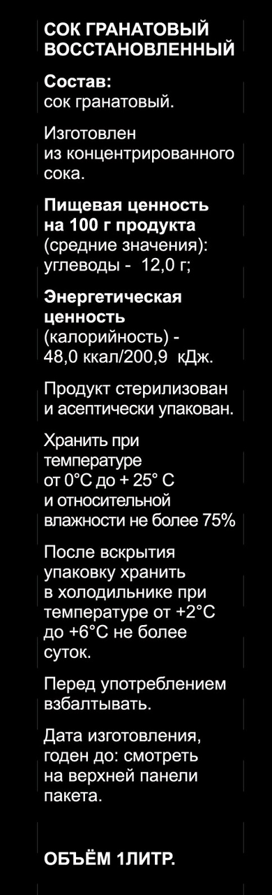 Натуральный продукт, 100% гранатовый сок. Он повышает гемоглобин, помогает при малокровии, общем упадке сил, простуде, улучшает пищеварение. Заряжает энергий, освежает и придает сил. Используется как прохладительный напиток или основа для коктейлей. Поможет начать день с удовольствием и пользой. Попробуйте использовать напиток в коктейлях, дополняйте десерты или просто пейте охлажденным.