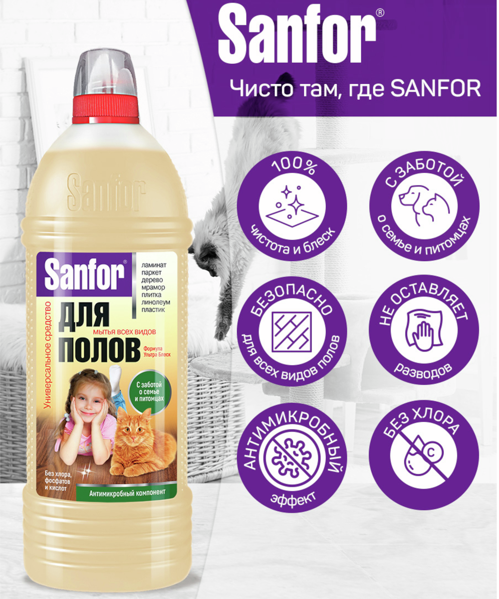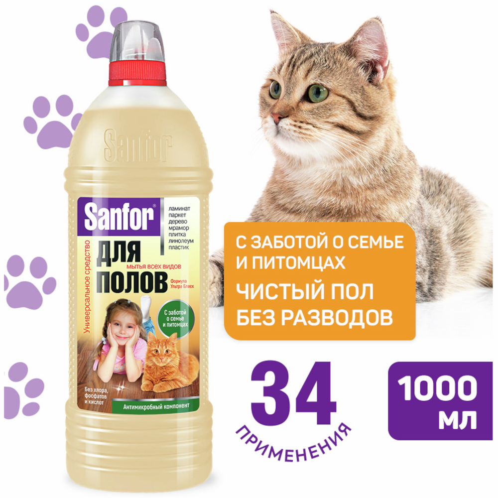 Средство чистящее Sanfor Ультра блеск для мытья полов Забота о домашних питомцах 1л предназначено для мытья всех видов напольных покрытий: ламината, линолеума, паркета, дерева, керамической плитки, мрамора, пластика. Прекрасно подойдет для домов, в которых проживают домашние животные. Его мягкая формула без хлора, фосфатов и кислот эффективно устраняет мыльные и жировые подтеки, грязь, пыль и налет, оказывает антимикробное и антистатическое действие, а также нейтрализует неприятные запахи и придает поверхностям сияющий блеск чистоты. Средство не оставляет разводов, не требует смывания водой, обладает приятным ароматом. Условия хранения: не ограничен. Средство замерзает, после размораживания сохраняет свои свойства.