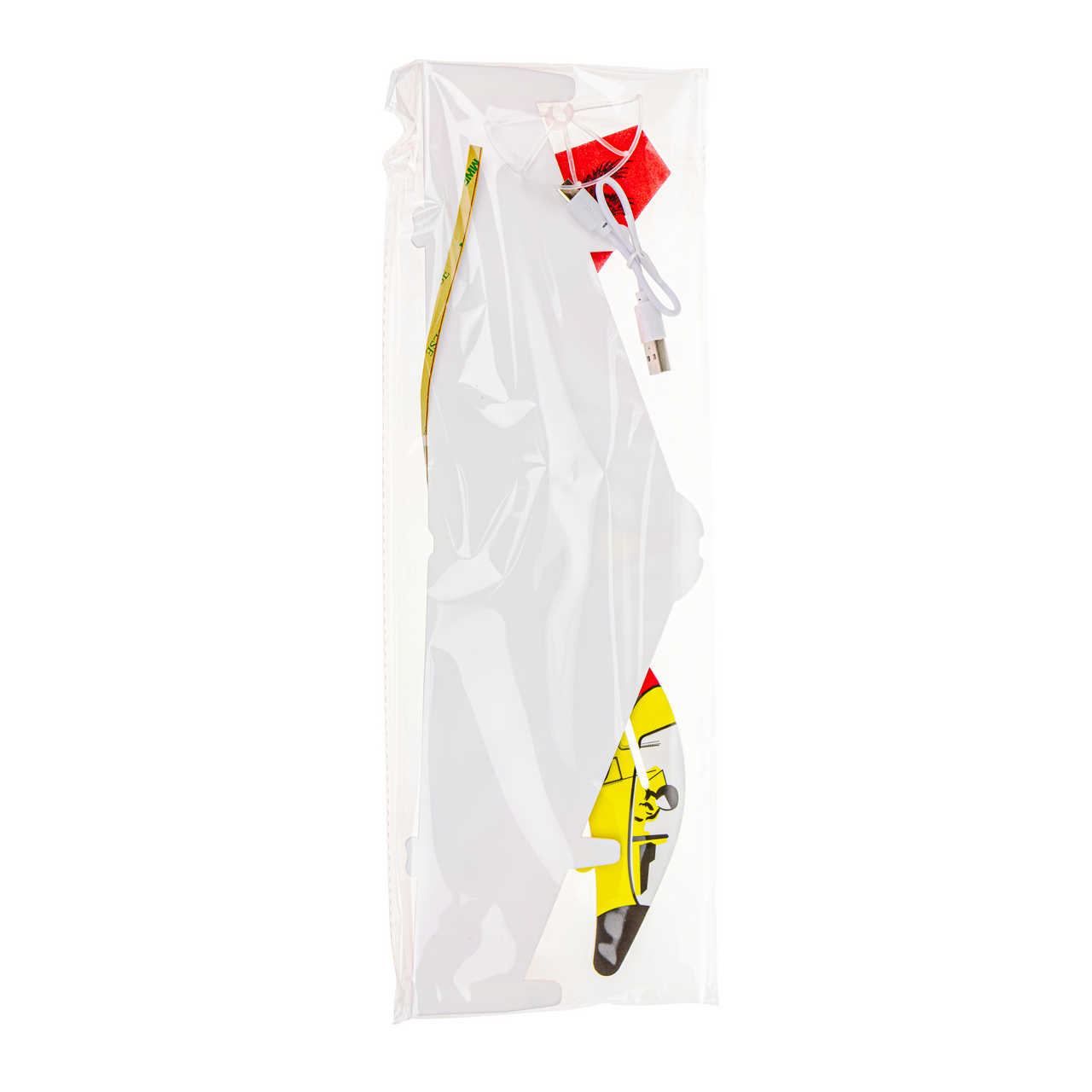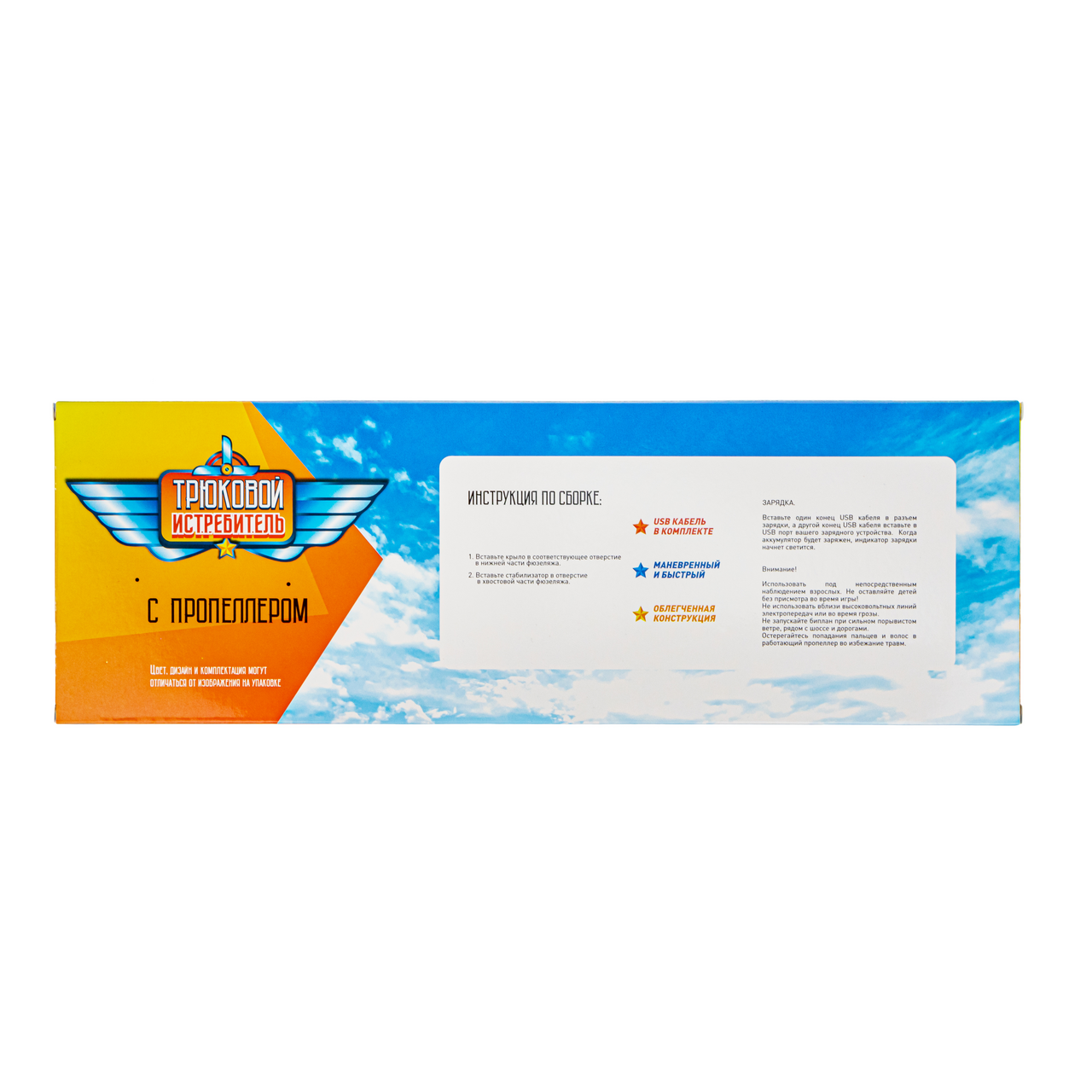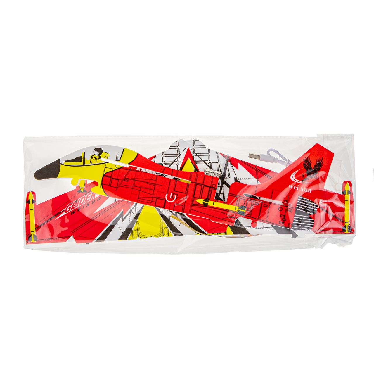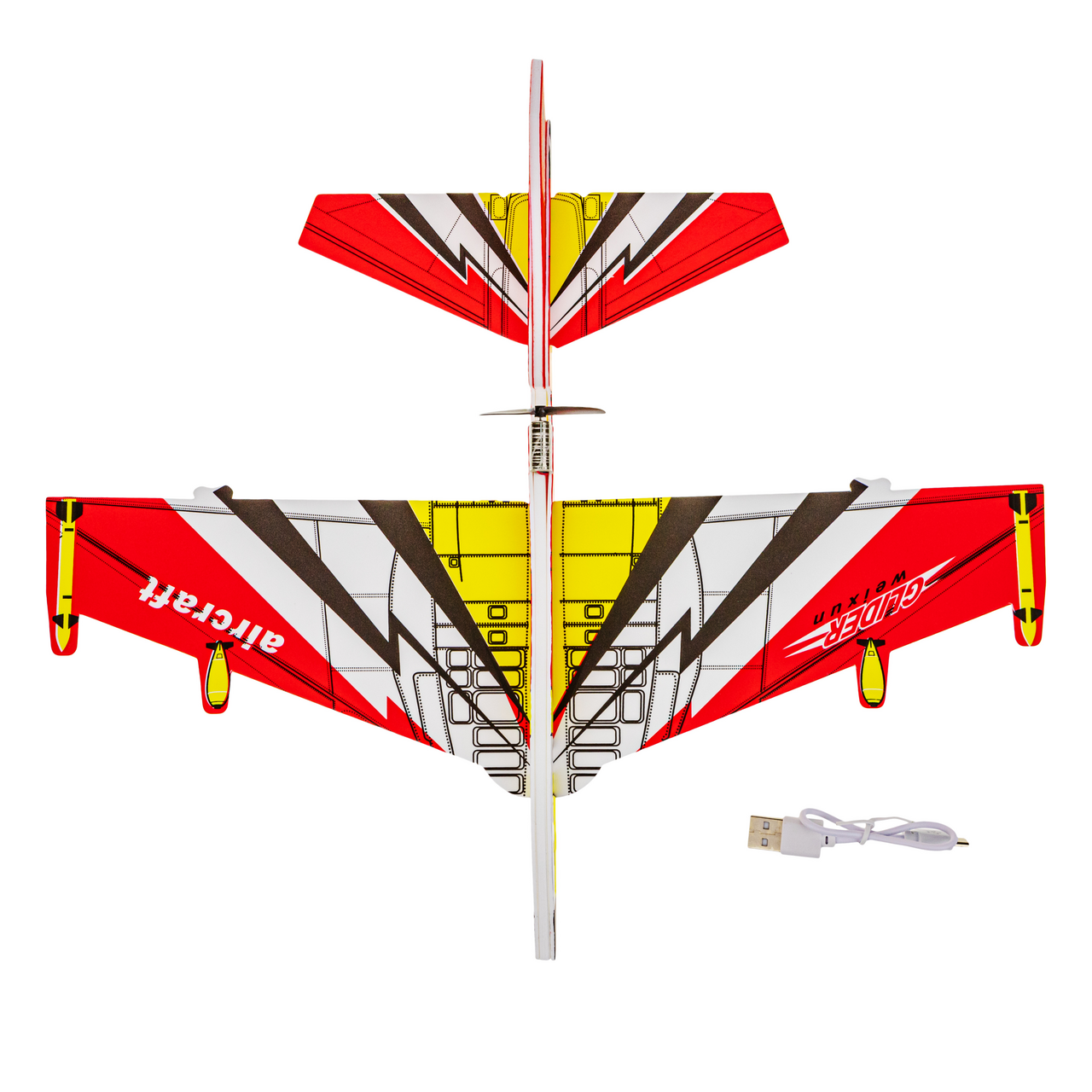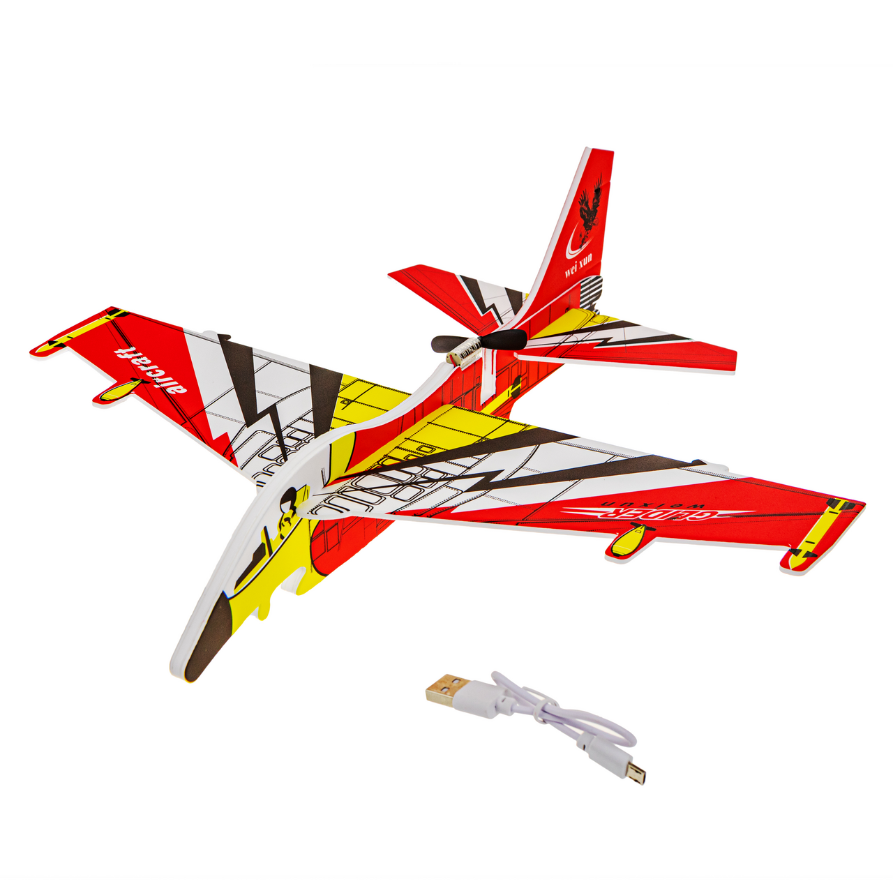 Для это�� модели использован пенопласт: материал отлично держит форму и благодаря малому весу обеспечивает длительный полет и красивое планирование. Корпус и крылья декорированы LED-нитью, которая дает эффектную подсветку в темное время суток. Можно играть с таким глайдером одному или устраивать воздушный бой с друзьями, запуская два и более самолета навстречу друг другу. Сборка модели занимает несколько минут.
