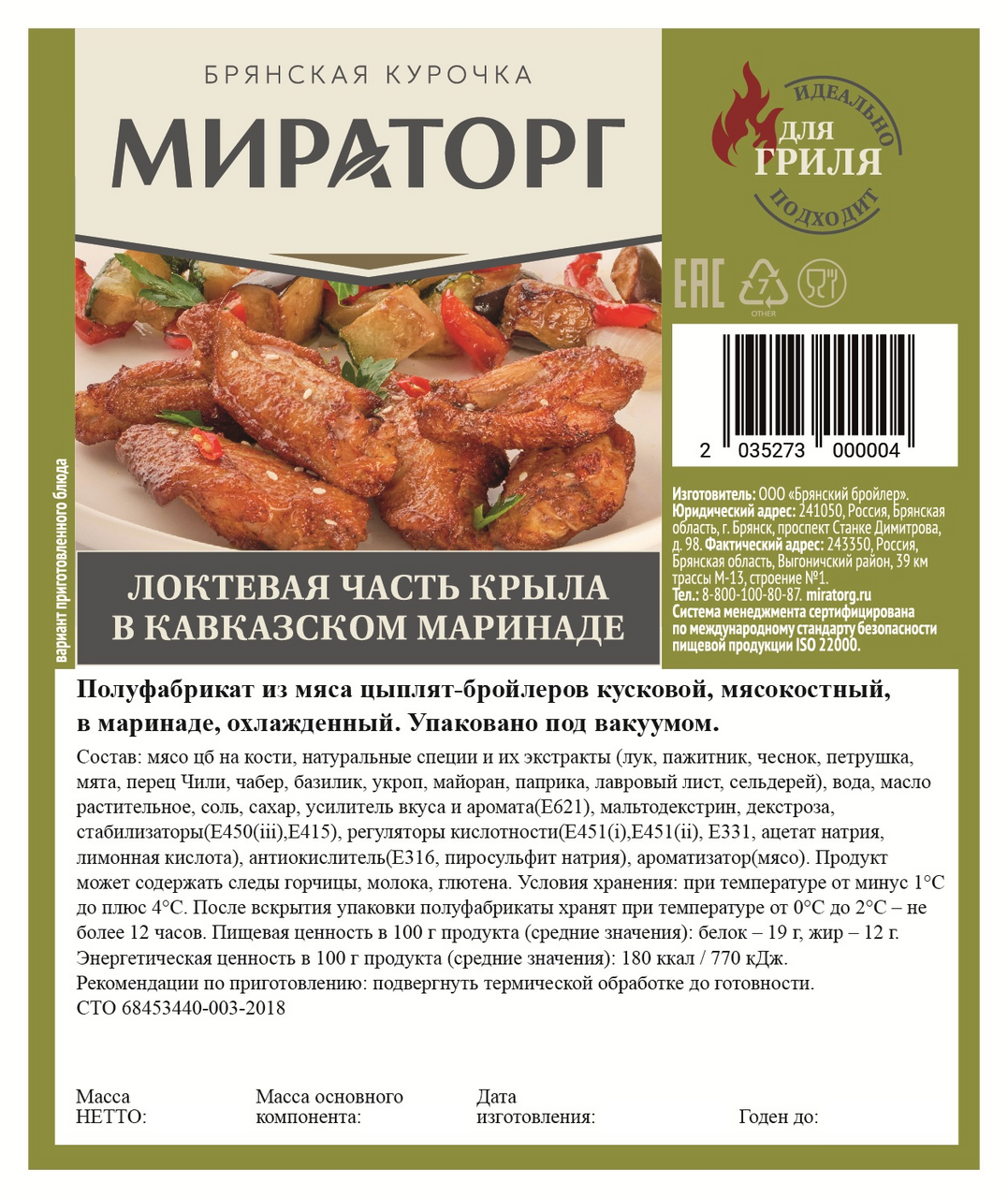 Часть крыла цыпленка-бройлера локтевая Мираторг в кавказском маринаде охлажденная, ~2.2кг