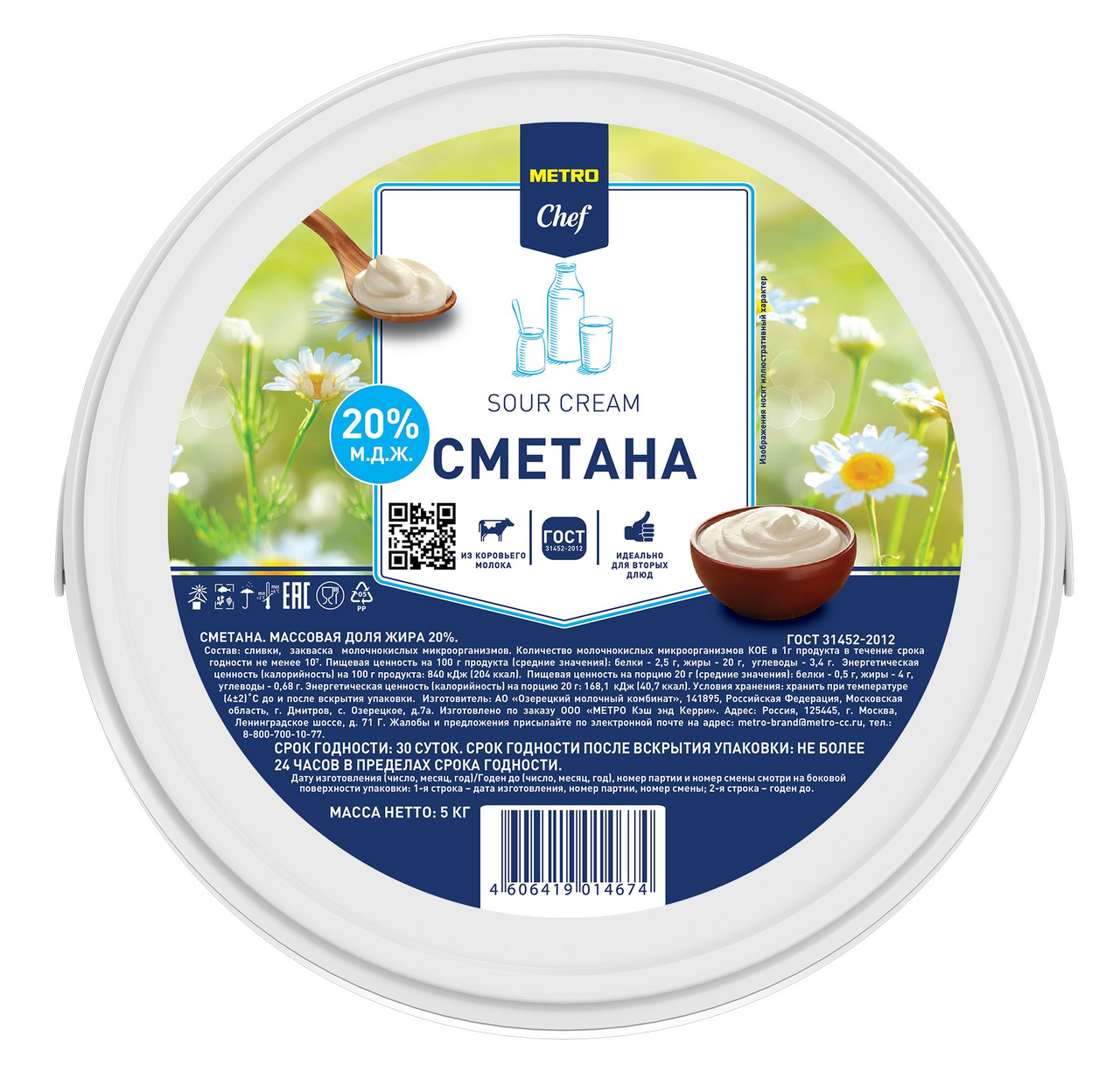 Сметана 20% METRO Chef, 5 кг изготовлена на основе сливок и заквасочных микроорганизмов. Выделяется натуральным сливочным вкусом и бархатной текстурой. Сметана не расслаивается, густой консистенции. Не содержит в составе ГМО, консервантов, усилителей вкуса, красителей и стабилизаторов. Жирность составляет 20%. Добавлять сметану можно в горячие блюда, готовить на ее основе соусы или крема для выпечки, заправлять салаты, добавлять в творог.