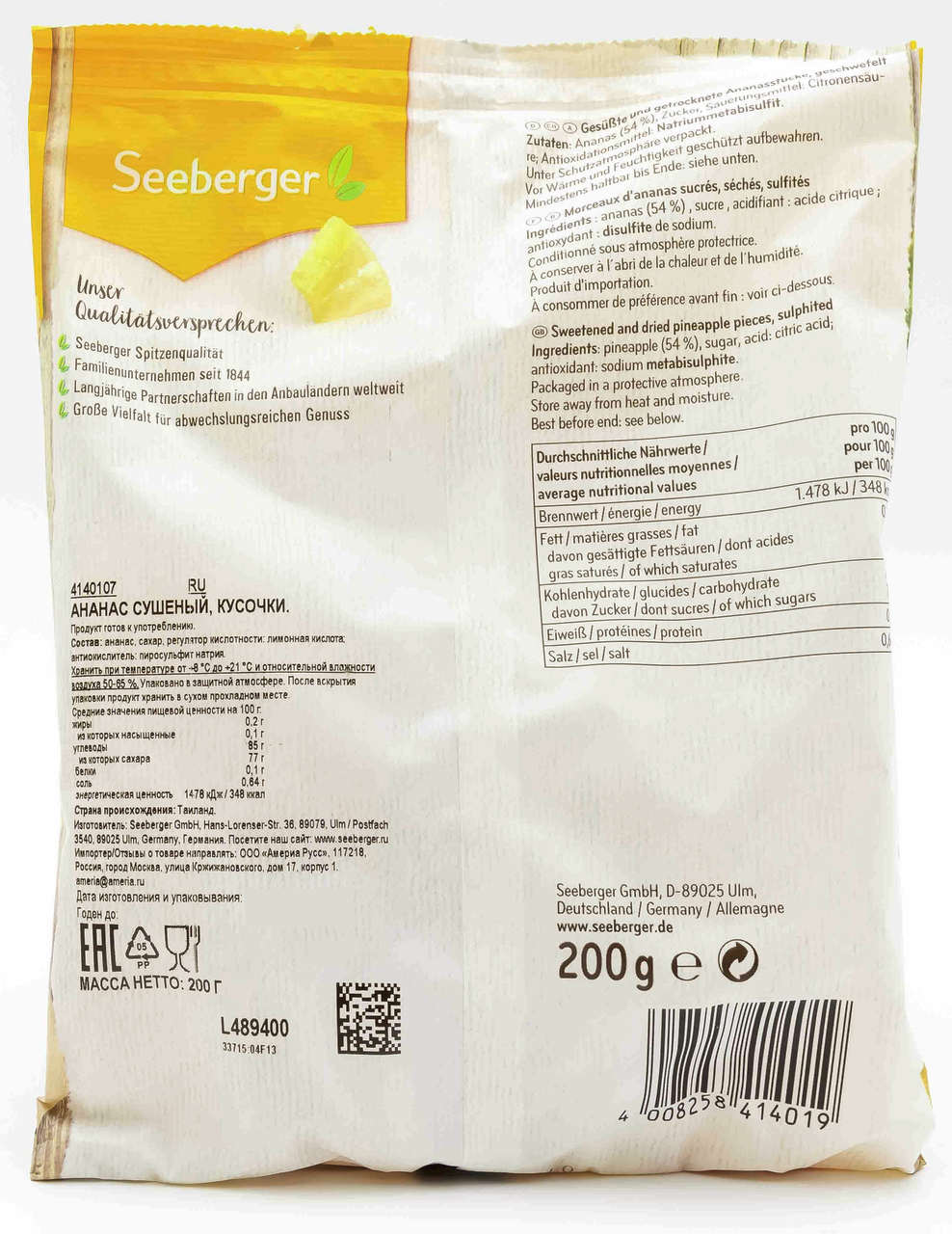 Ананасы Seeberger сушеный кусочками, 200г