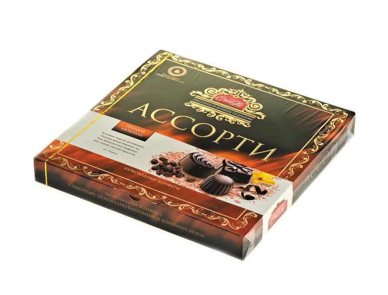 Набор конфет из темного шоколада ассорти со сливочной начинкой, шоколадно-ванильным и кофейным вкусами 235г.