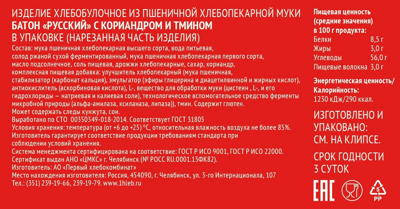 Мука пшеничная хлебопекарная высшего сорта, вода питьевая, солод ржаной сухой ферментированный, мука пшеничная хлебопекарная первого сорта, масло подсолнечное, соль пищевая, дрожжи хлебопекарные, сахар, кориандр, комплексная пищевая добавка: улучшитель хлебопекарный (мука пшеничная, стабилизатор (карбонат кальция), эмульгатор (эфиры глицерина и диацетилвинной и жирных кислот), антиокислитель (аскорбиновая кислота), L-, вещество для обработки муки (цистеин, L-, и его гидрохлориды - натриевая и калиевая соли), технологическое вспомогательное средство ферменты микробной природы (альфа-амилаза, ксиланаза, липаза)), таин.