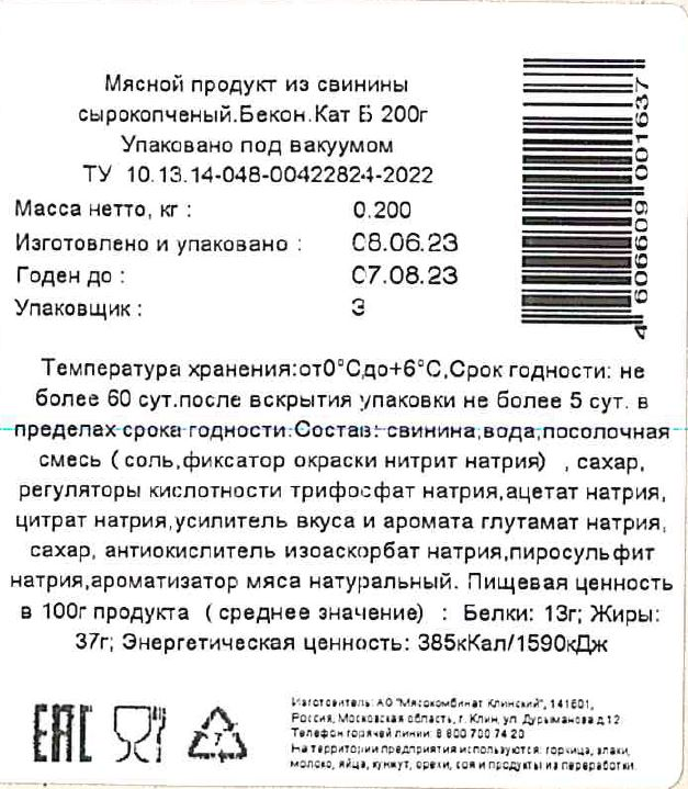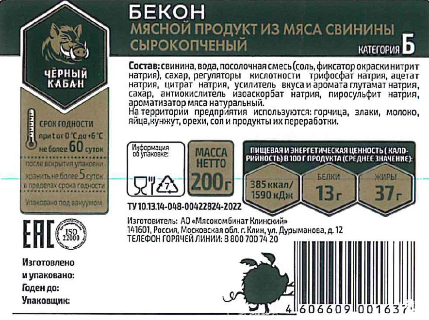 Полностью готовый к употреблению продукт. Свиная грудинка включает в себя мякоть и жировую прослойку, которая обеспечивает продукту сочность. Необычная черная оболочка делает вид бекона еще более интересным и эстетичным. Деликатес употребляют как самостоятельную закуску, используют для приготовления бутербродов, салатов, омлетов и других блюд. Отличным дополнением к бекону станут томаты, сыр, зелень и перепелиные яйца.