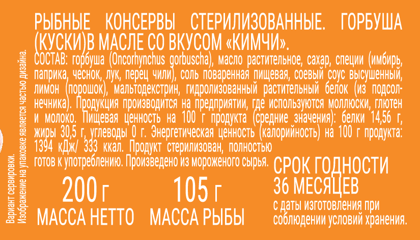 Это авторское прочтение вкусо-ароматического ансамбля овощных гарниров по традиционной Корейской технологии. Помимо оттеняющей мягкой кислинки и ароматной пряности, основные вкусовые нотки, которые вы обнаружите в кимчи — это паприка, лук и чеснок с оттенками имбиря и острого перца. Именно в сбалансированном сочетании кислого, сладкого и острого вкусов, кроется долголетняя популярность кимчи не только на родине, но и по всему миру. Продукт уже готов к употреблению. Готовьте закуски, ешьте с гарниром - выбирайте вариант, который больше любите. Разнообразить свой рацион рыбных продуктов и выбрать любимый вкус легко с Капитан Вкусов.