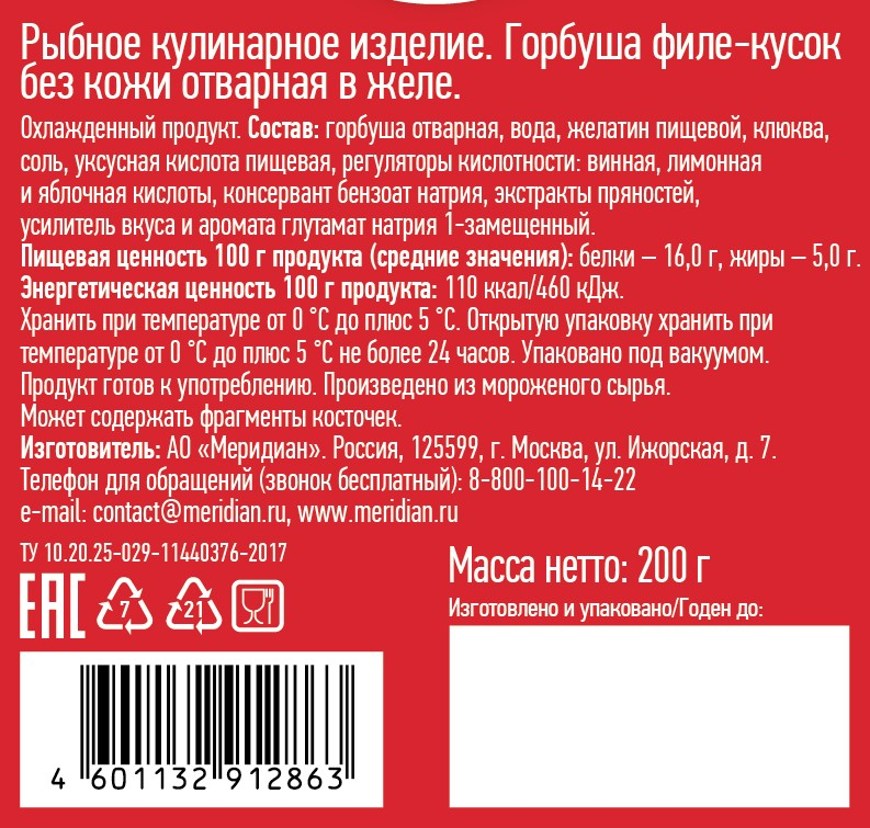 Горбуша отварная, вода, желатин пищевой, клюква, соль, уксусная кислота пищевая, регуляторы кислотности: винная, лимонная и яблочная кислоты, консервант бензоат натрия, экстракты пряностей, усилитель вкуса и аромата глутамат натрия 1-замещенный.