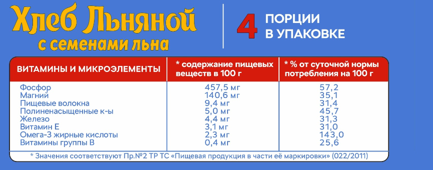Мука льняная, мука ржаная хлебопекарная обдирная, меланж жидкий пастеризованный, яблочное пюре (яблоко свежее, сахар, загуститель дикрахмаладипат ацетилированный), семена льна, маргарин (масло подсолнечное рафинированное дезодорированное, вода, эмульгаторы (моно- и диглицериды жирных кислот, эфиры полиглицерина и жирных кислот), соль, ароматизатор, краситель каротин, регулятор кислотности лимонная кислота), порошок из шелухи подорожника, соль, кориандр молотый, регулятор кислотности диацетат натрия, антислеживатель диоксид кремния.