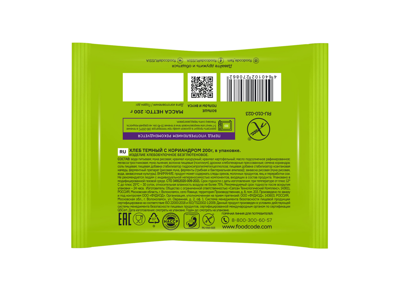 Вода питьевая, мука рисовая, крахмал кукурузный, крахмал картофельный, масло подсолнечное рафинированное, меласса тростниковая, мука льняная, волокна пищевые (псиллиум), дрожжи хлебопекарные прессованные, сахар, соль пищевая, стабилизатор гидроксипропилметилцеллюлоза, стабилизатор ксантановая камедь, ферментный препарат (рисовая мука, ферменты (грибная и бактериальная амилаза)), кориандр, закваска рисовая (мука рисовая, вода, заквасочные культуры).
