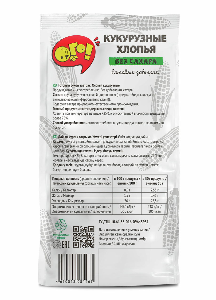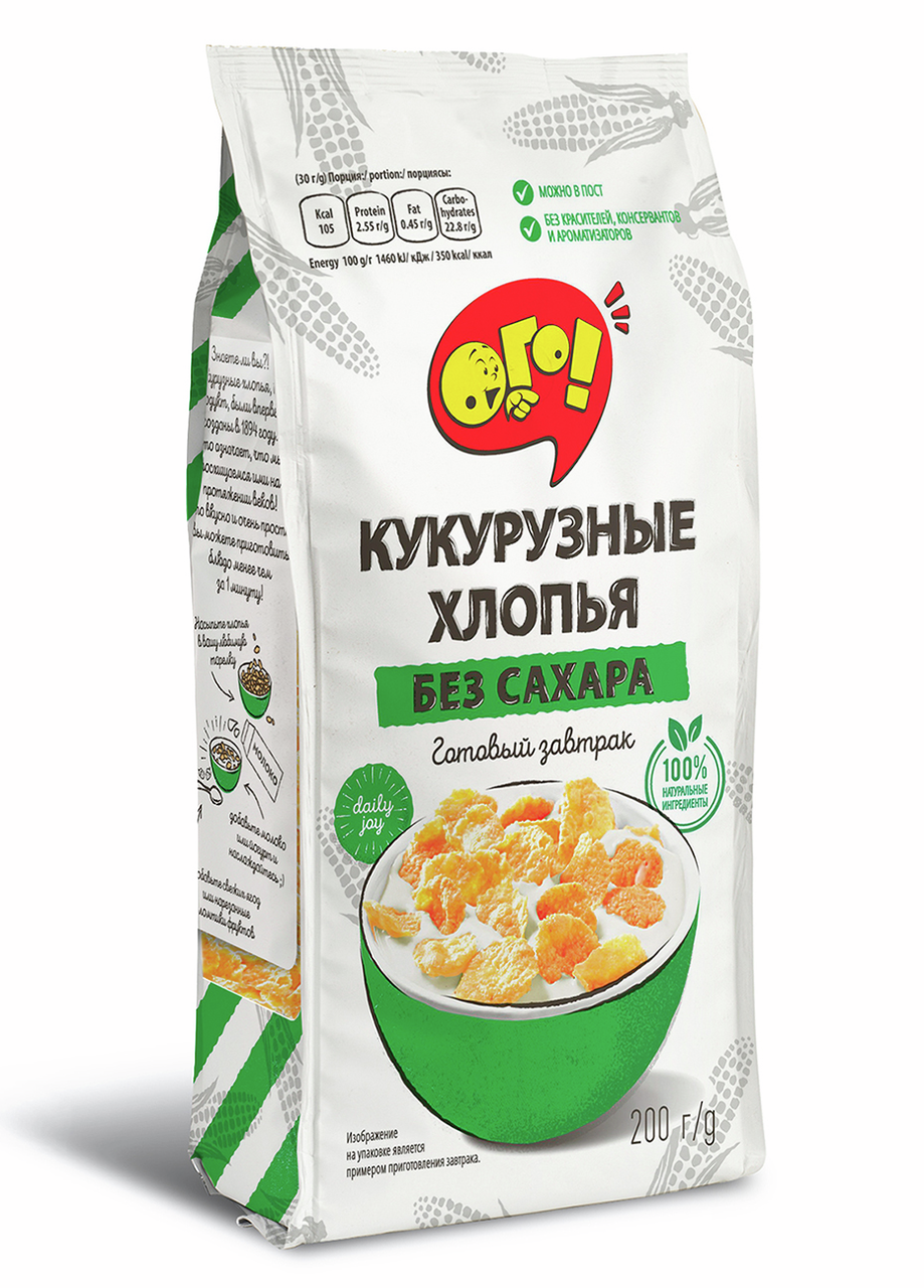 Хлопья Ого! кукурузные без сахара, 200 г — диетический продукт, созданный производителем с соблюдением стандартов качества. Их можно залить молоком или йогуртом, использовать как перекус в поездке, на работе. Хлопья оптимально употреблять в качестве дополнения основного рациона. Они быстро утоляют чувство голода, а также насыщают организм энергией на весь день. Продукт полезен за счет входящих в состав аминокислот и многих витаминов, которые регулируют обмен веществ, помогают в работе нервной системы, желудочно-кишечного тракта. Кукурузные хлопья с натуральным вкусом понравятся взрослым.
