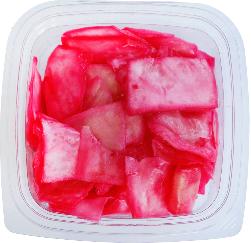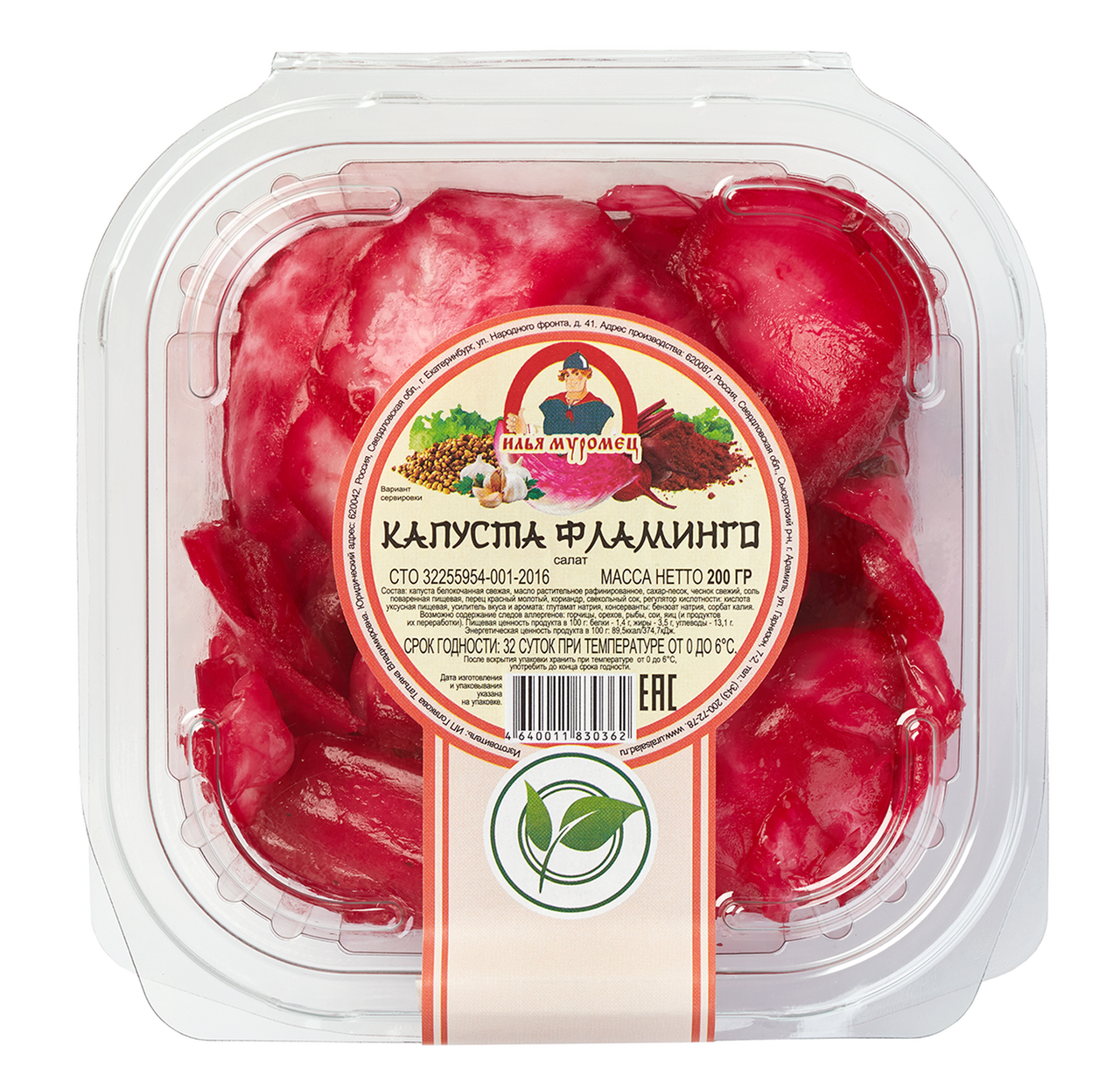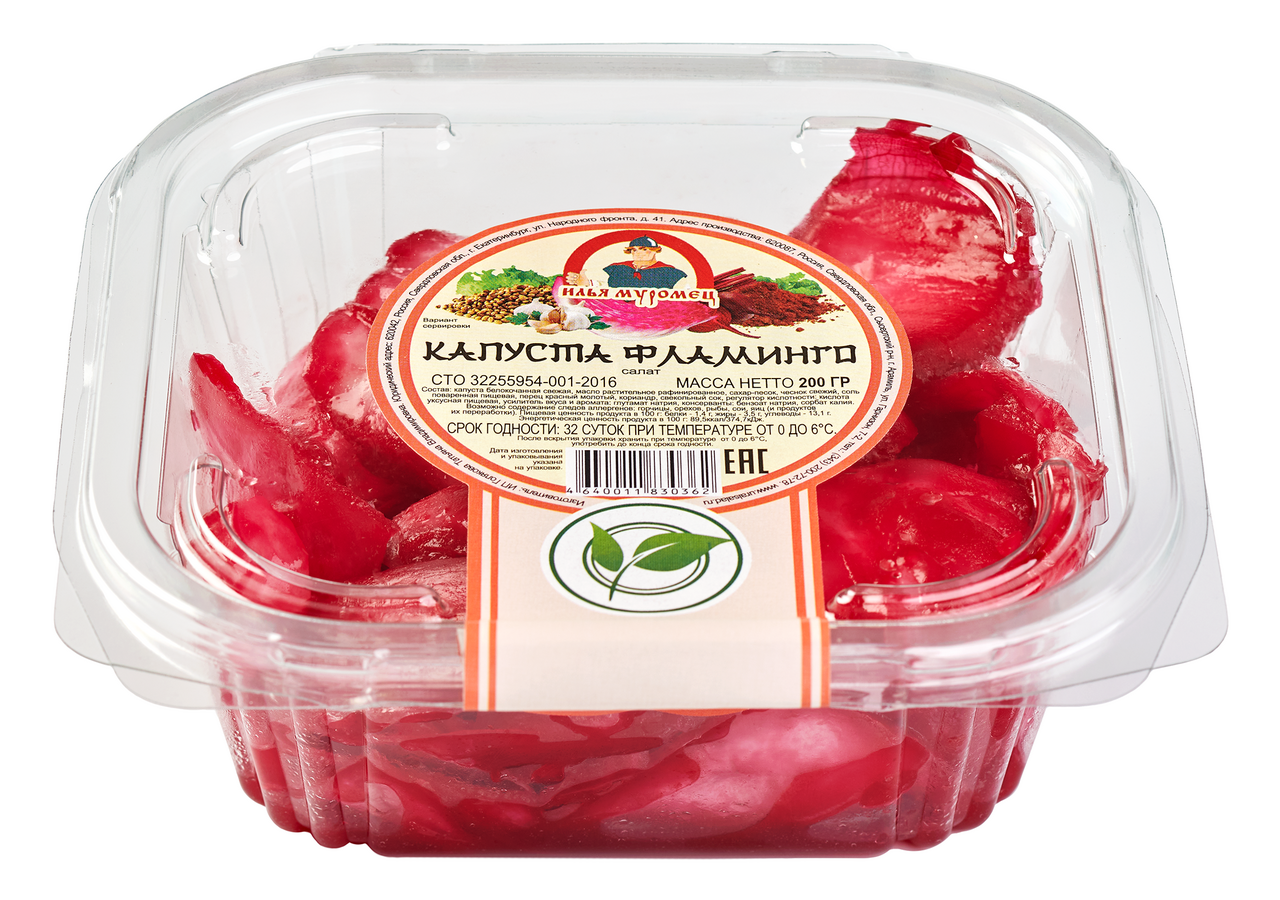 Капуста белокочанная свежая, масло растительное рафинированное, сахар-песок, чеснок свежий, соль поваренная пищевая, перец красный молотый, кориандр, свекольный сок, регулятор кислотности: кислота уксусная пищевая, усилитель вкуса и аромата: глутамат натрия, консерванты: бензоат натрия, сорбат калия.