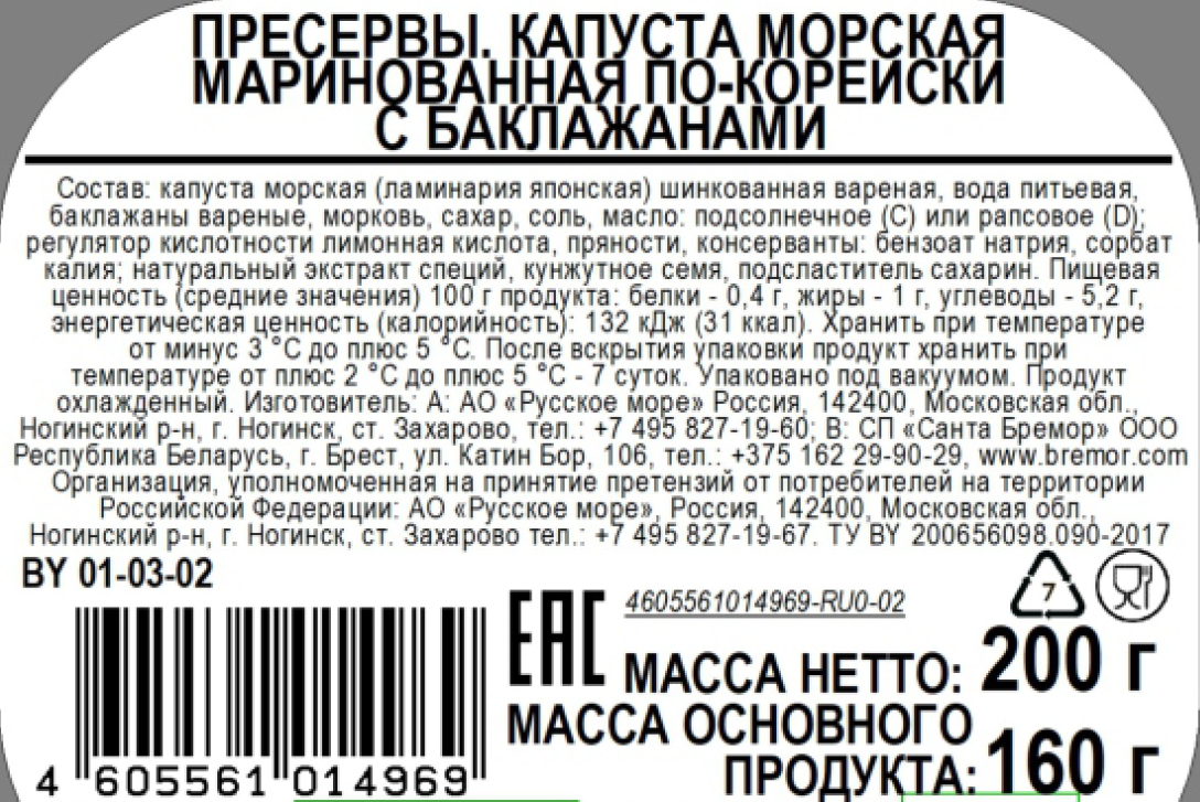 Капуста морская (ламинария японская) шинкованная вареная, вода питьевая, баклажаны вареные, морковь, сахар, соль, масло: подсолнечное (С) или рапсовое (D); регуляторы кислотности: лимонная, яблочная кислоты; пряности, консерванты: бензоат натрия, сорбат калия; натуральный экстракт специй, кунжутное семя, подсластитель сахарин.