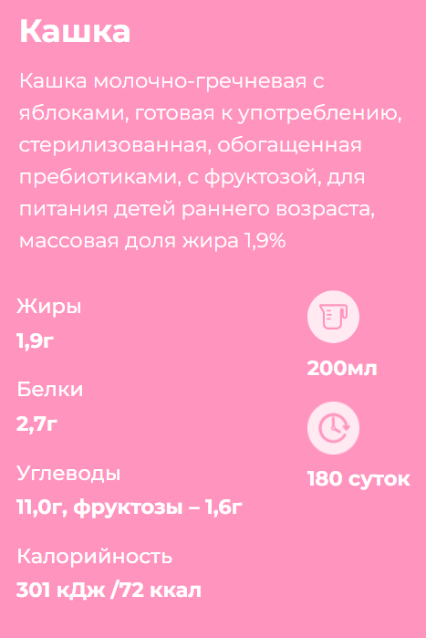 Стерилизованный продукт обогащен пребиотиками, с фруктозой. Каша адаптирована к особенностям детского пищеварения и обмена веществ. Кашка молочно-гречневая с яблоками, готовая к употреблению, стерилизованная, обогащенная пребиотиками, с фруктозой, для питания детей раннего возраста. После вскрытия упаковки, кашка хранению не подлежит.