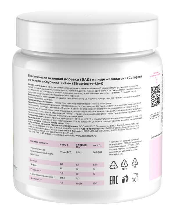Комплексная пищевая добавка Prime Kraft Коллаген Киви-клубника, 200г