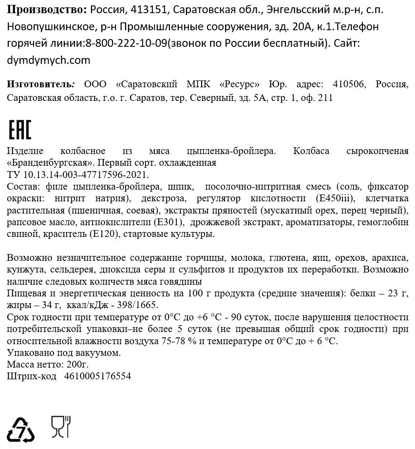 Колбаса Дым Дымыч Браденбургская сырокопченая срез, 200г