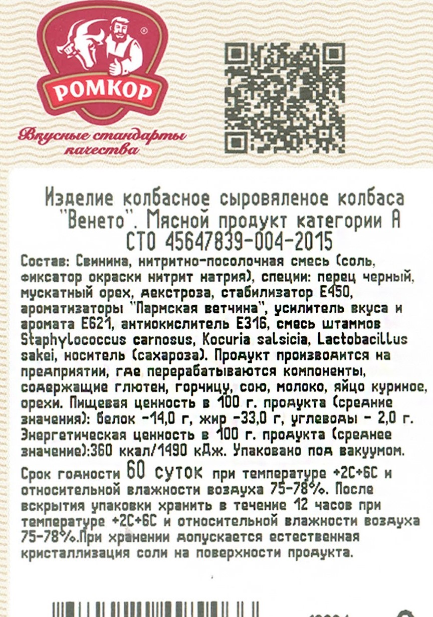 Колбаса Ромкор Венето сыровяленая срез, 200г