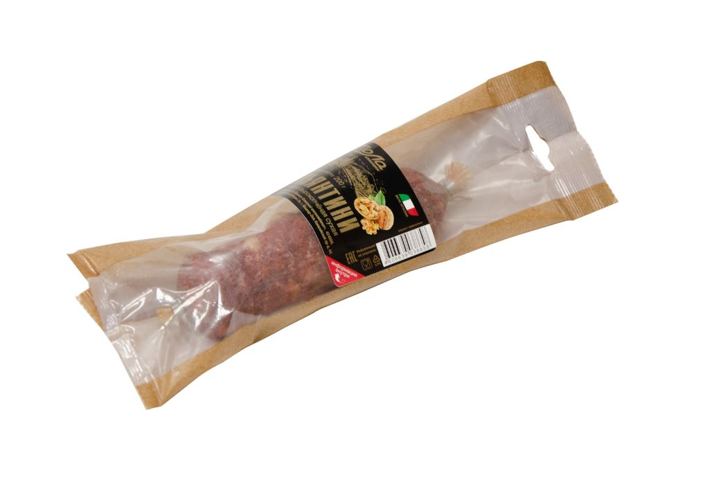 Свинина, шпик свиной, нитритно-посолочная смесь соль пищевая, фиксатор окраски: нитрит натрия, виноградный сахар, пряности перец черный, перец белый, стартовая культура, ароматизатор грецкий орех, краситель гемоглобин, антиокислитель аскорбат натрия.