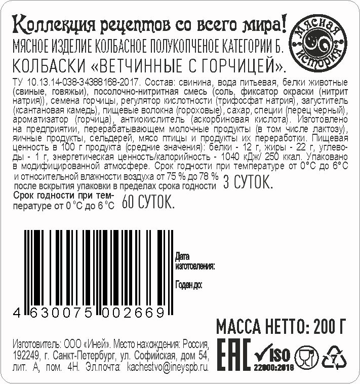Колбаски Мясная История Ветчинные полукопченые с горчицей, 200г