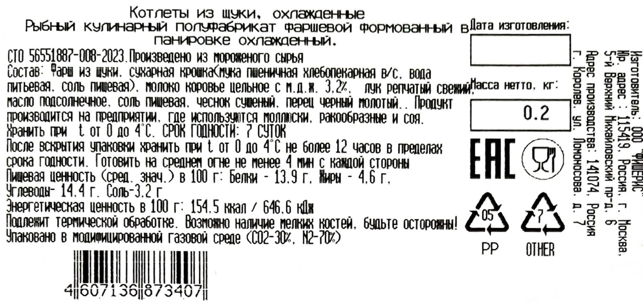 Фарш из щуки, сухарная крошка (мука пшеничная хлебопекарная в/с, вода питьевая, соль пищевая), молоко коровье цельное с м.д.ж. 3.2%, лук репчатый свежий, масло подсолнечное, соль пищевая, чеснок сушеный, перец черный молотый.