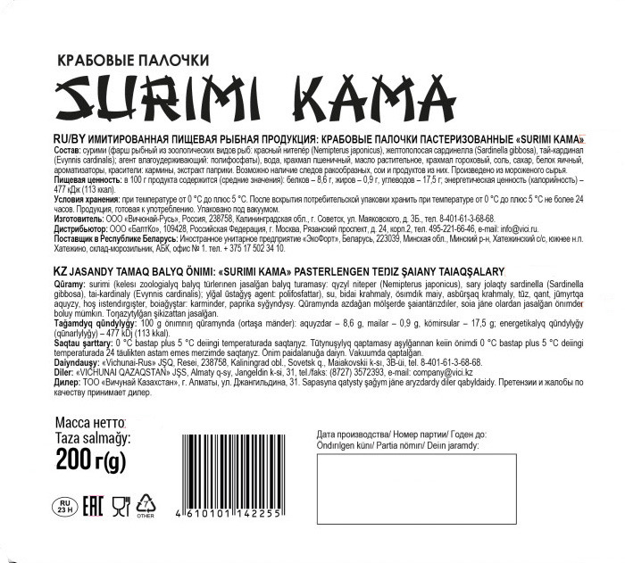 Сурими (фарш рыбный из зоологических видов рыб: красный нитепёр (Nemipterus japonicus), желтополосая сардинелла (Sardinella gibbosa), тай-кардинал (Evynnis cardinalis); агент влагоудерживающий: полифосфаты), вода, крахмал пшеничный, масло растительное, крахмал гороховый, соль, сахар, белок яичный, ароматизаторы, красители: кармины, экстракт паприки.