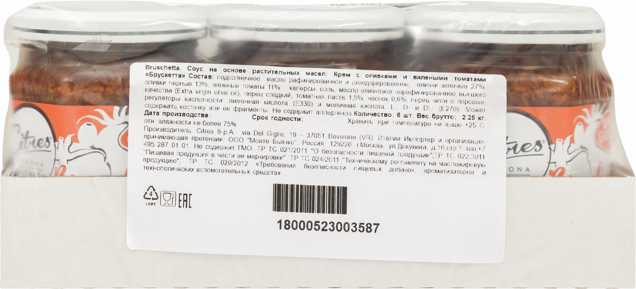 Крем Citres с оливками и вялеными томатами, 200 г – идеальное решение для приготовления оригинальных и невероятно вкусных брускетт. Когда хочется итальянской кухни, но нет возможности сходить в кафе, это продукт поможет вам порадовать себя и близких аппетитной закуской. Крем обладает однородной консистенцией, соблазнительным вкусом и непередаваемым ароматом. Его легко и просто наносить как на свежий хлеб, так и на поджаренный тост и слегка подсушенную чиабатту. От такого угощения не откажутся даже маленькие гурманы, а гости точно попросят добавки. Продукт украсит собой как повседневный, так и праздничный стол. Он произведен в Италии с соблюдением всех норм качества. Продукт обладает безопасным составом и не содержит в составе искусственных добавок. При желании крем можно положить в пасту и дополнить им овощной салат. С этим продуктом любое блюдо станет в разы вкуснее и аппетитнее. Порадуйте себя и близких оригинальными блюдами вместе с нежным кремом от Citres.
