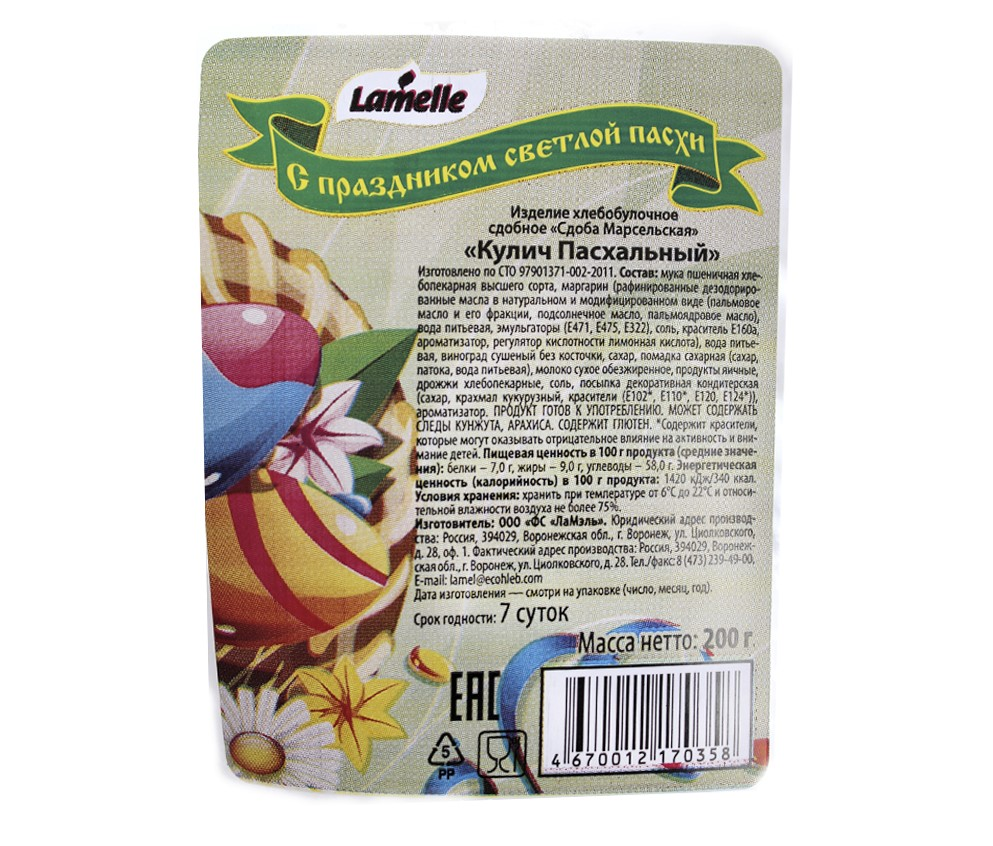 Мука пшеничная хлебопекарная высшего сорта, маргарин (рафинированные дезодорированные масла в натуральном и модифицированном виде (пальмовое масло и его фракции, подсолнечное масло, пальмоядровое масло), вода питьевая, эмульгаторы (Е471, Е475, Е322), соль, краситель Е1603, ароматизатор, регулятор кислотности лимонная кислота), вода питьевая, виноград сушеный без косточки, сахар, помадка сахарная (сахар, патока, вода питьевая), молоко сухое обезжиренное, продукты яичные, дрожжи хлебопекарные, соль, посыпка декоративная кондитерская (сахар, крахмал кукурузный, красители (Е102, Е110, Е120, Е124)), ароматизатор.