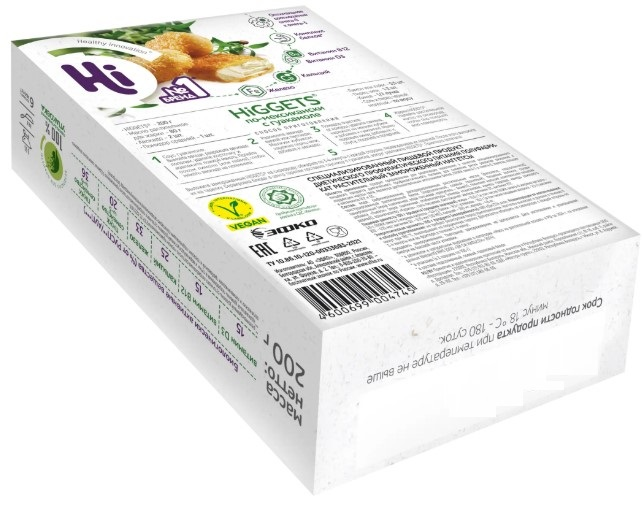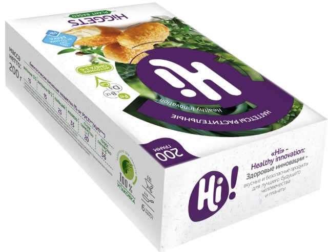 Мы задумали Healty Innovation – Здоровые инновации или Hi!, чтобы создавать еду будущего. Наша миссия - создавать такие продукты питания, которые улучшают здоровье каждого человека и здоровье нашей планеты. Продукты, которые продлевают здоровое долголетие, уменьшают нагрузку на экологию и бережнее относятся как к окружающей нас природе, растениям, так и к животным. Продукт идеально подходит не только для вегетарианцев, но и для тех, кто готов отказаться от мяса, но не готов отказаться от своих вкусовых привычек. Сочные наггетсы из растительного мяса Hi идеально сочетаются как с любым гарниром, так и в виде самостоятельной закуски.