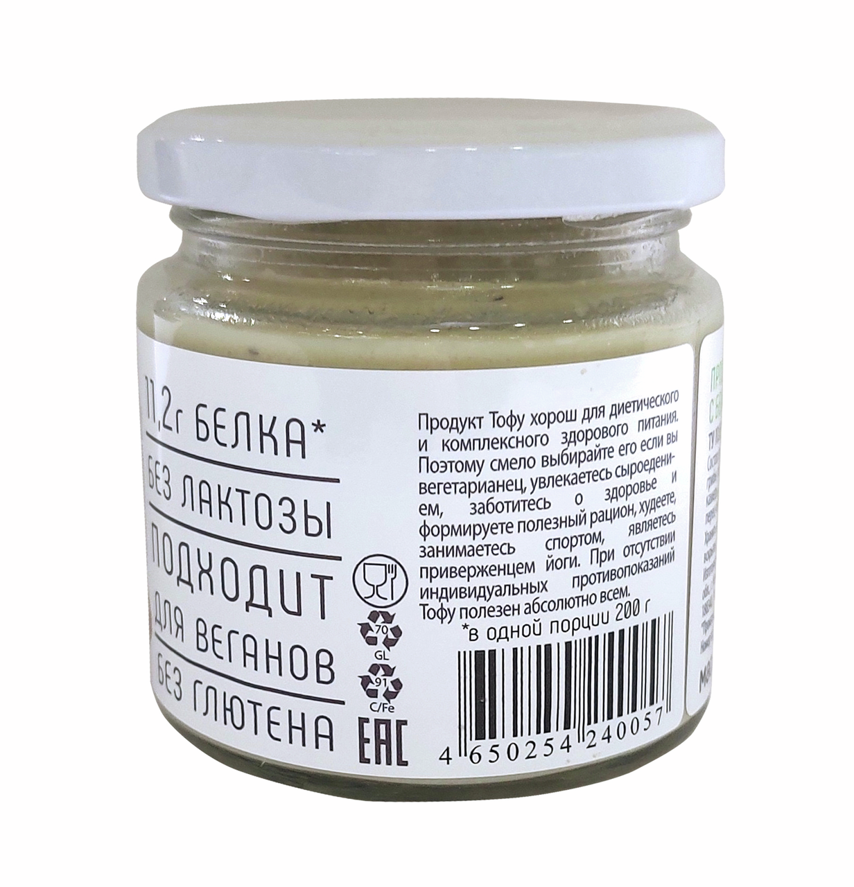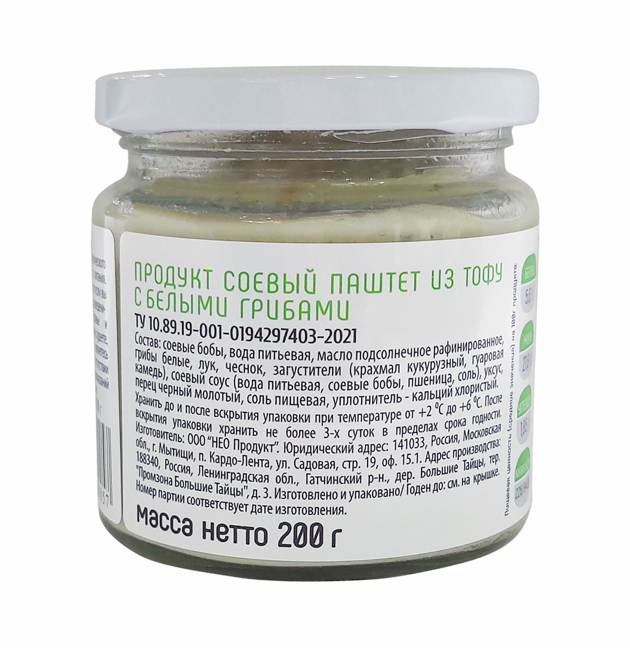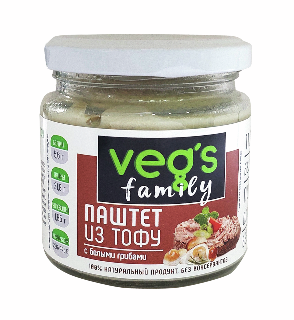 Паштет Veg's из тофу с белыми грибами, 200 г – вкусный и сытный продукт, который по достоинству оценят вегетарианцы, те, кто соблюдает пост, придерживается правильного питания и у кого есть непереносимость лактозы. Тофу делается исключительно из натуральных соевых бобов, в которых содержится большое количество белка, так необходимого организму человека. Благодаря этому этот продукт выступает прекрасной альтернативой мясу, рыбе и птице. Паштет на основе тофу дополнен с белыми грибами, которые придают продукту особый вкус и аромат. Паштет обладает приятной однородной консистенцией и хорошо наносится на свежий хрустящий багет, мягкий, нежный батон и пористую воздушную чиабатту. Продукт в умеренном количестве не навредит фигуре. Такой аппетитный и сытный паштет уместно подать как на повседневный, так и на праздничный стол. А за счет практичной упаковки и небольшого веса его можно взять с собой в дорогу и в офис, чтобы устроить полноценный перекус. Состав: соевые бобы, вода питьевая, масло подсолнечное рафинированное, грибы белые, лук, чеснок, загустители (крахмал модифицированный кукурузный, гуаровая камедь), соевый соус, уксус, перец черный молотый, соль пищевая, коагулянт — кальций хлористый.