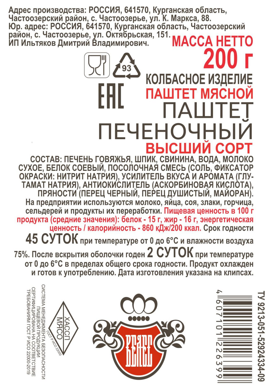 Печень говяжья, шпик, свинина, молоко сухое, белок соевый, посолочная смесь соль поваренная пищевая, фиксатор окраски: нитрит натрия, пряности.